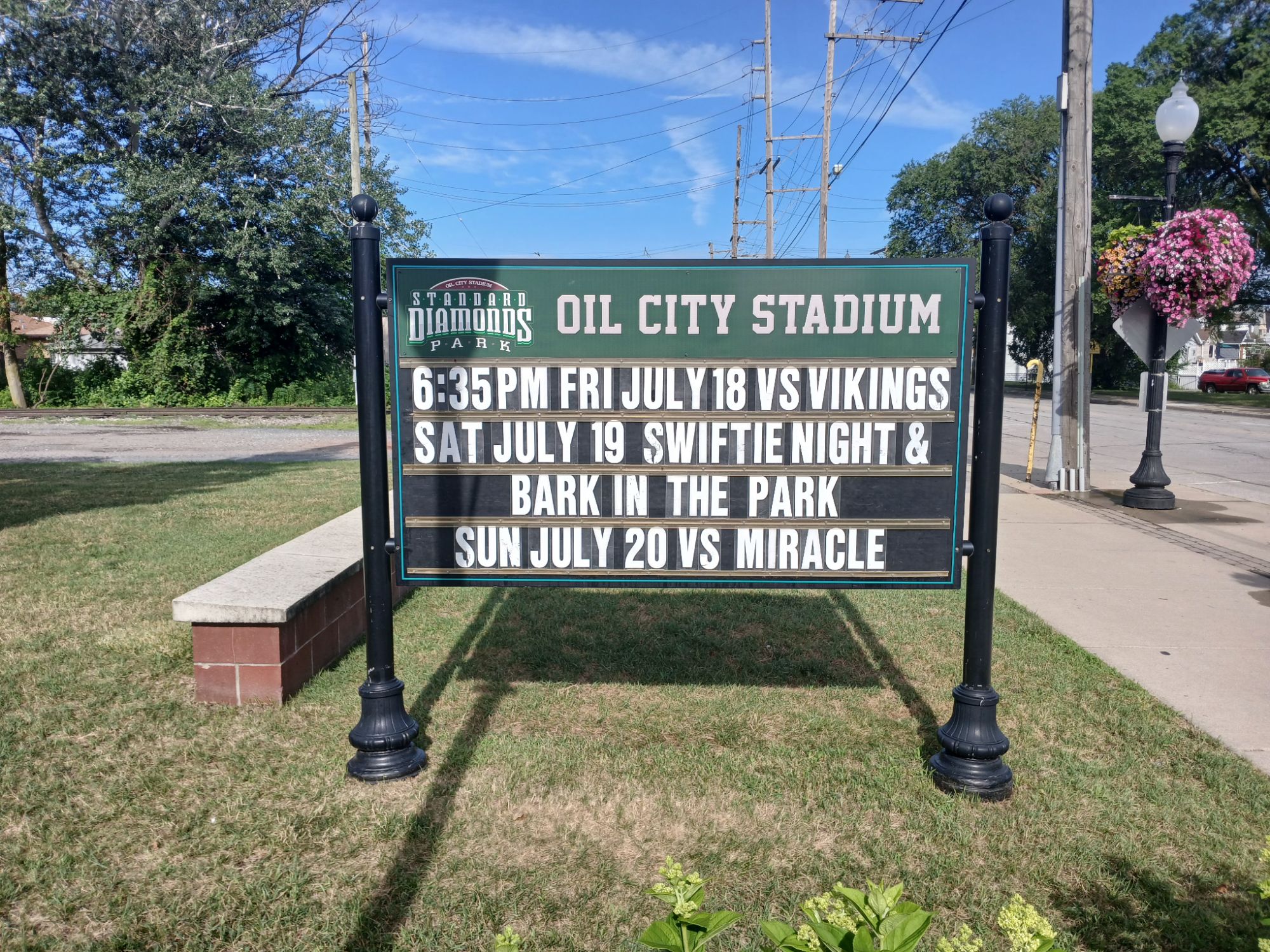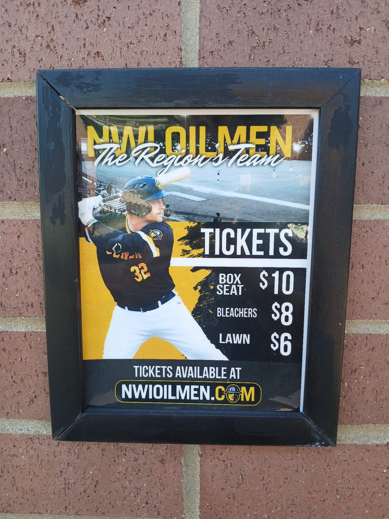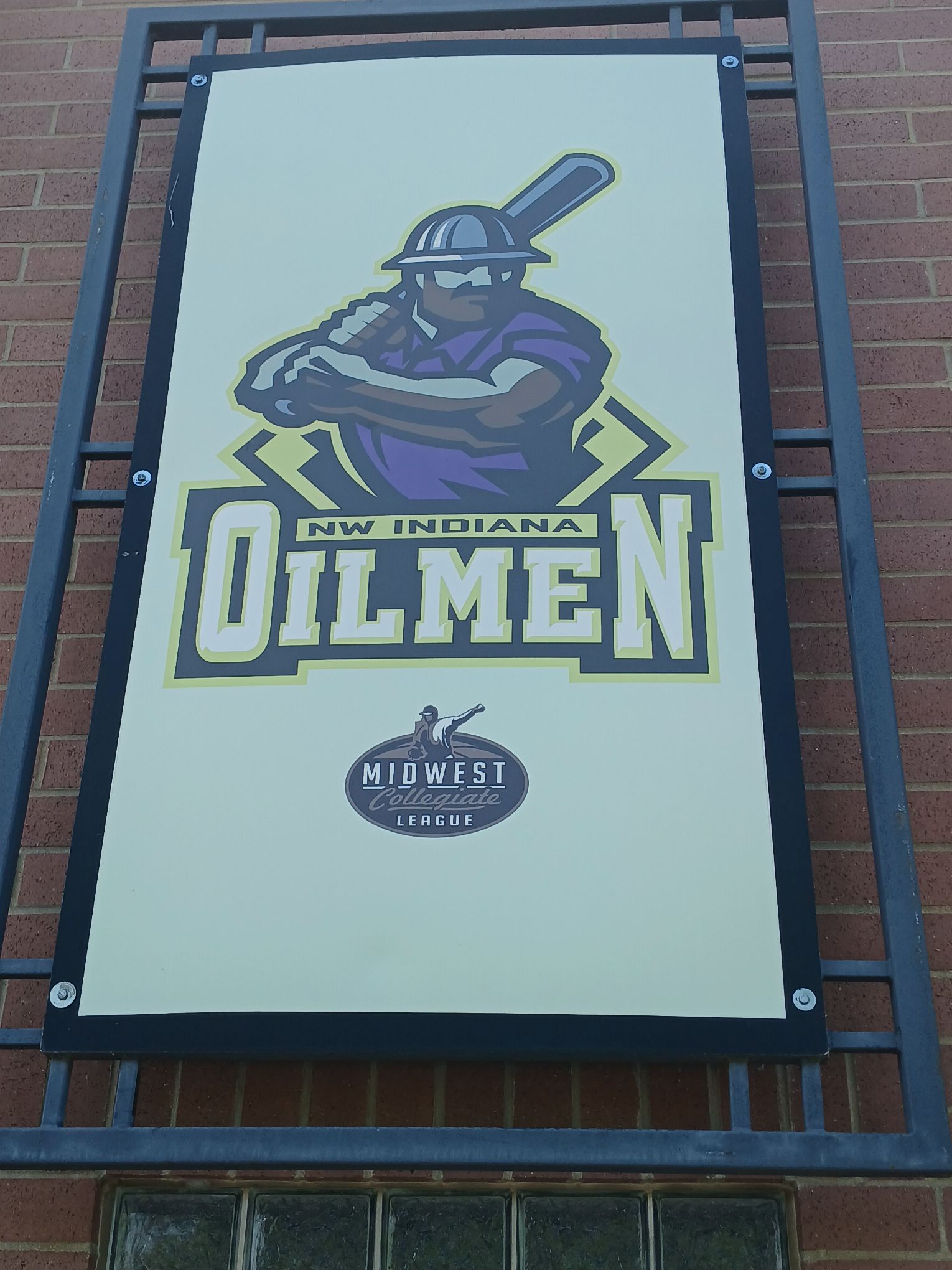 From my location in Schererville, it was pretty much a straight drive north about 15 miles to Whiting. When I arrived, I noticed the front gate of the stadium was open, so most likely, I would have access to view the inside of the stadium and get some good photos and information. I found street parking near the baseball stadium and began my journey up to the ballpark. The sign outside the stadium’s main gate area announced some upcoming events at Standard Diamonds Park at Oil City Stadium. Oil City Stadium is home to the NWI (Northwest Indiana) Oilmen, fitting given the area is surrounding by energy plants as far as the eye can see. The NWI Oilmen play in the Northern League, a summer collegiate baseball league here in the Illinois and Indiana area.