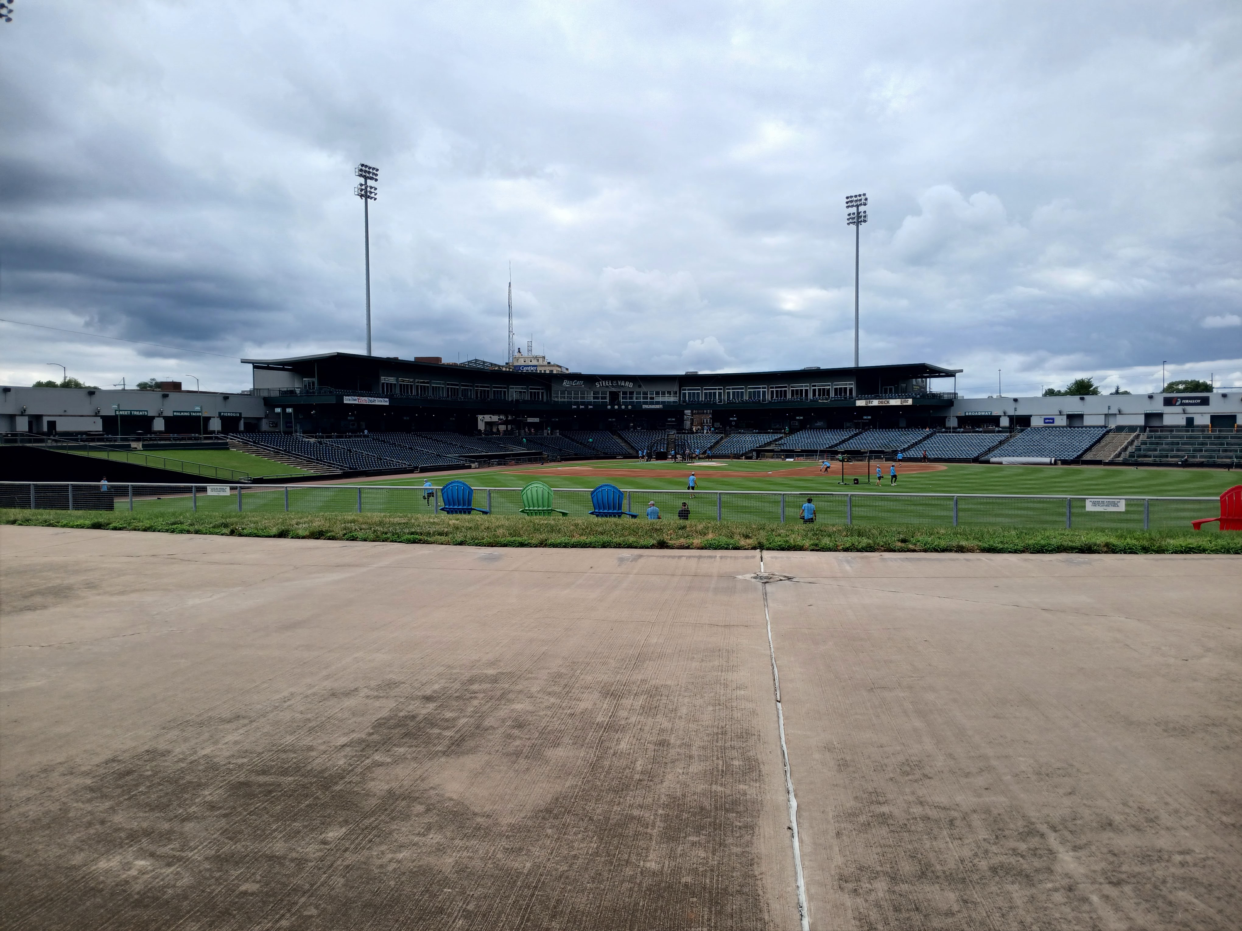 Sunday afternoon, while on a business trip to the Chicago/Northwest Indiana area, I did some baseball exploring in and around my hotel area. In the late morning hours, I took a short drive up to Gary, Indiana to visit the American Association’s Gary SouthShore RailCats’ Stadium, The Steel Yard. Gary, Indiana is a tough area to park and sightsee, I’ll just leave it at that. I did manage to snag a photo of the Steel Yard from the center field parking lot. Then, after a nice lunch at McAlister’s Deli, I hopped over to Crown Point, Indiana to catch the Lake County Corn Dogs 4pm game.