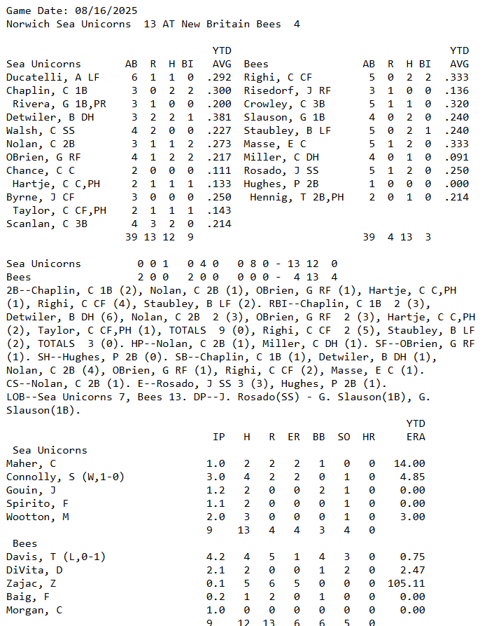 Congratulations to the Norwich Sea Unicorns of the Futures Collegiate Baseball League. The Sea Unicorns defeated the New Britain Bees to capture the 2025 FCBL Championship. Congrats to the Norwich Sea Unicorns players, coaches, interns, and families on an amazing 2025 season.