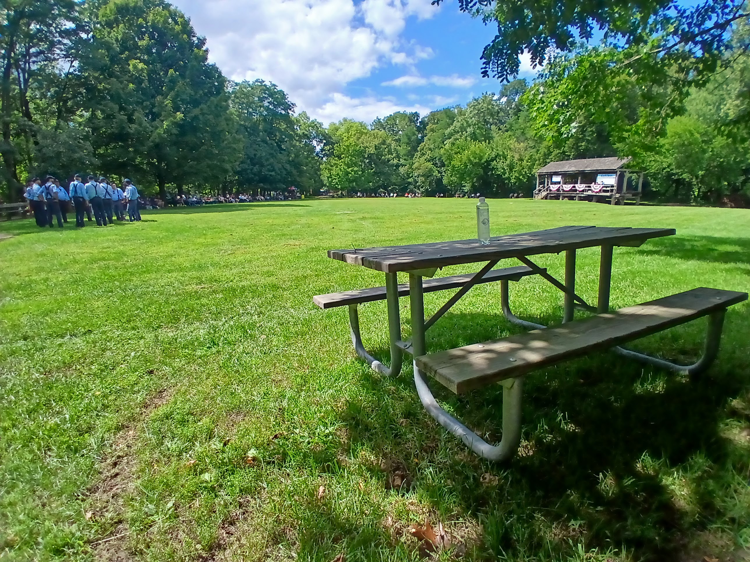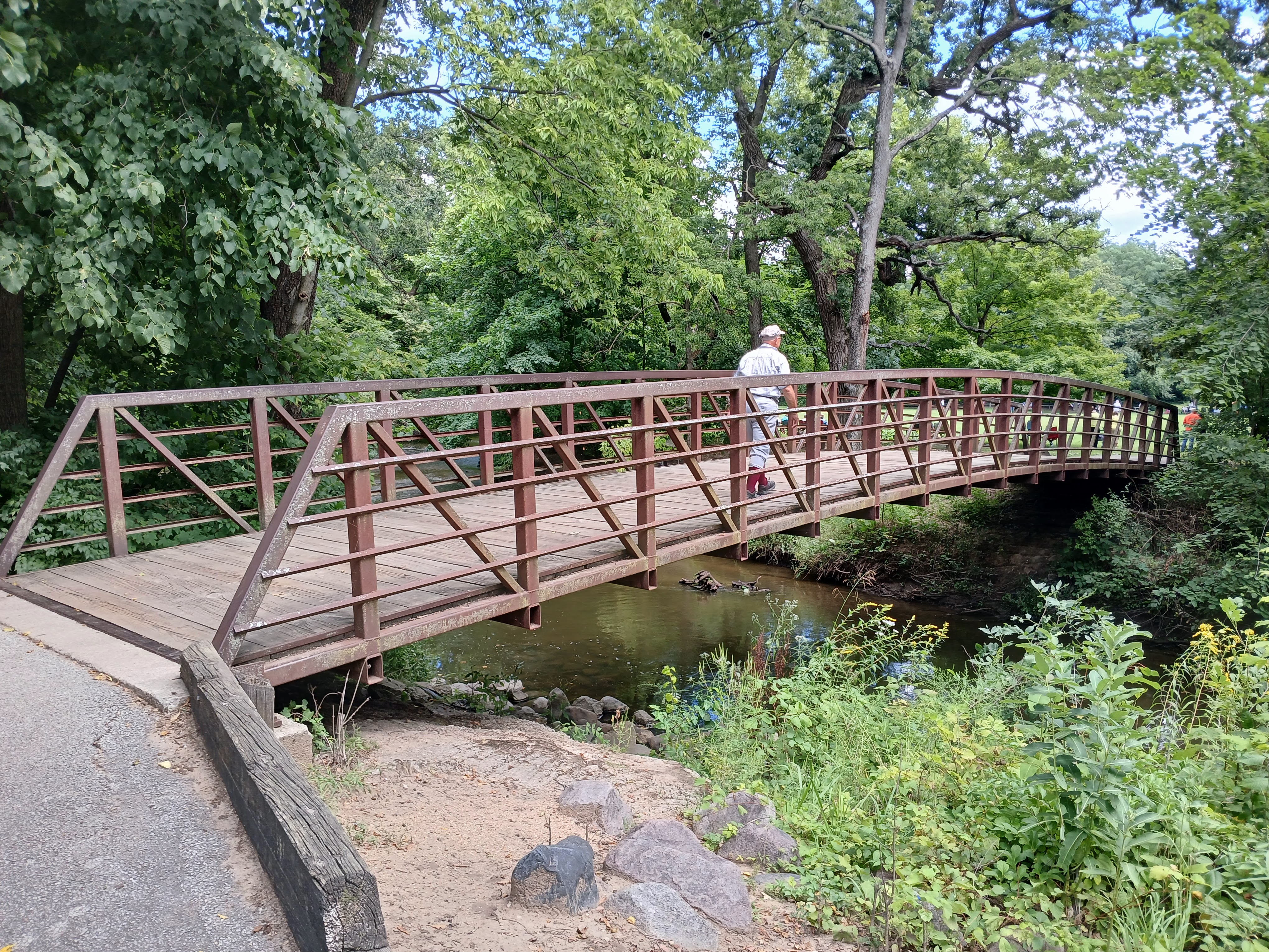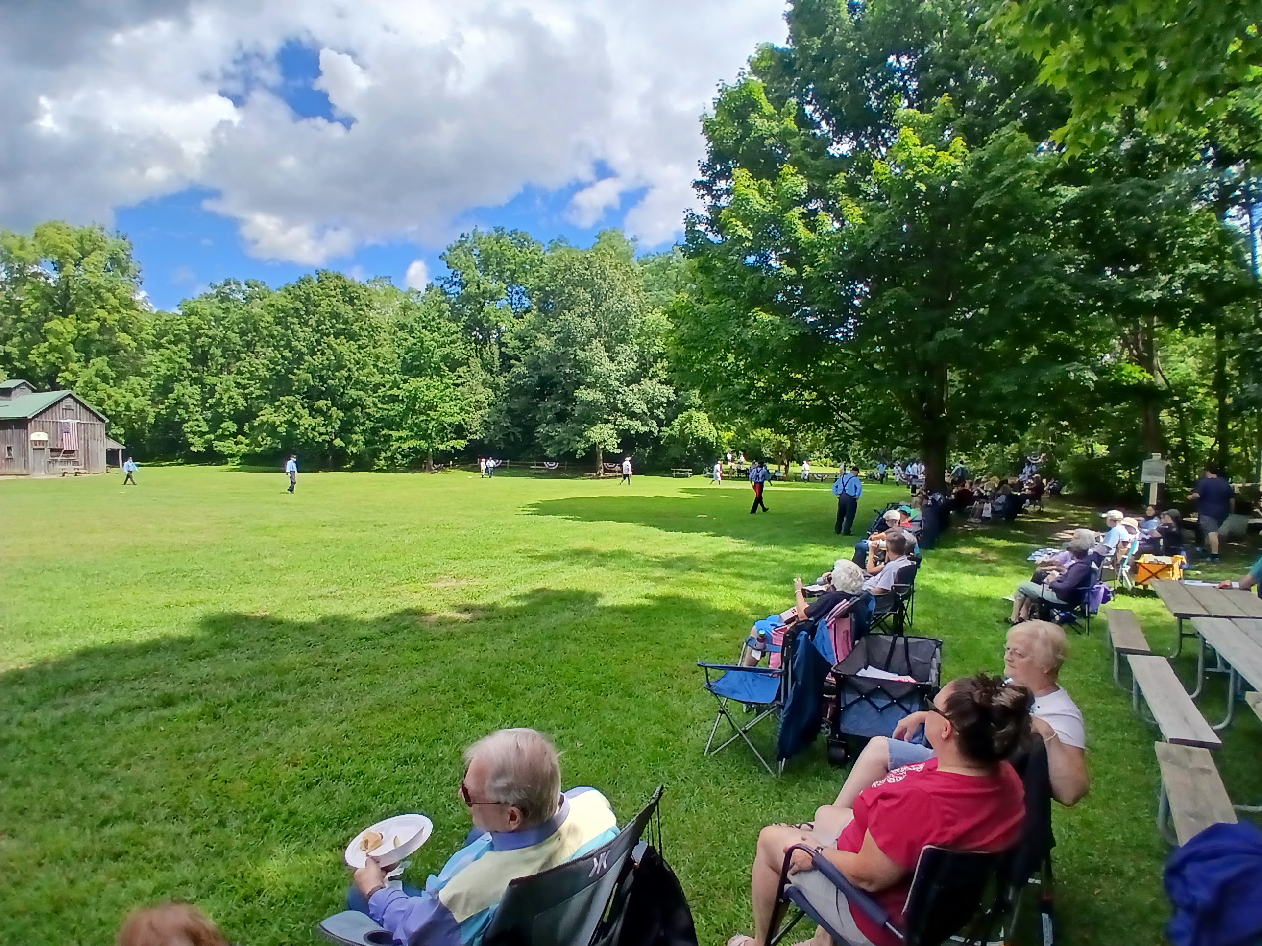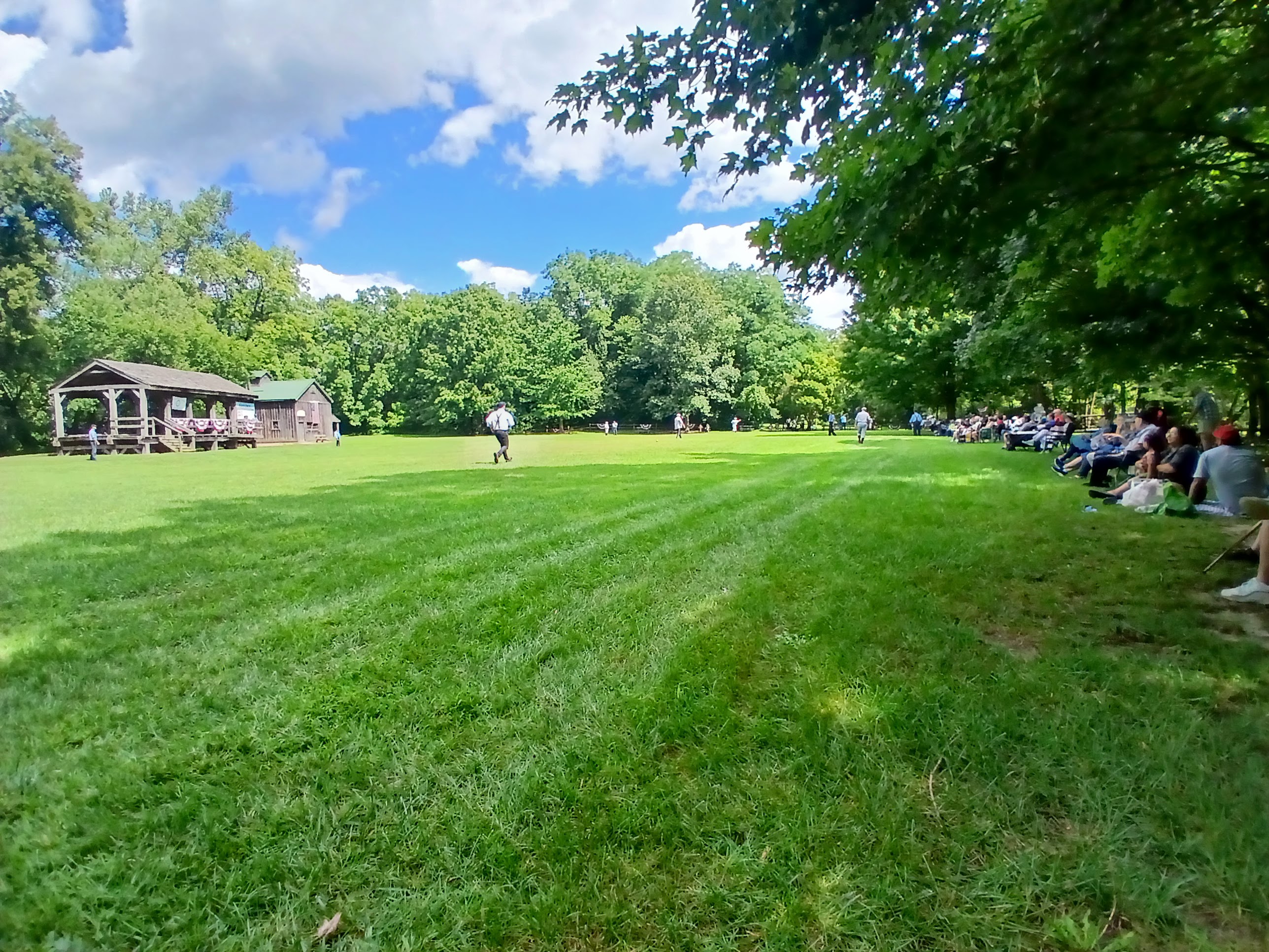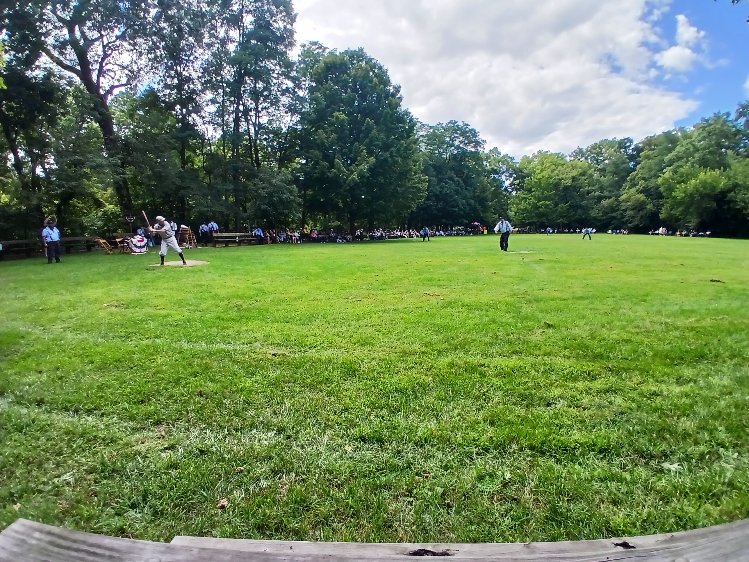 After a few innings of play, sadly, I had to depart to get ready for work. I walked slowly passed the two dugouts, the massive line of fans which was two or three lawn chairs deep along the left field sideline, and over to the outfield area near the bridge leading back to the parking lot. I stopped in the outfield to take in one or two more at bats, just soaking in the beauty of this “gentleman’s game” one last time. I was about to take a bridge (artistically) from the 1860s back to 2025 and I wanted a lasting impression of my time with this Vintage Base Ball experience.
