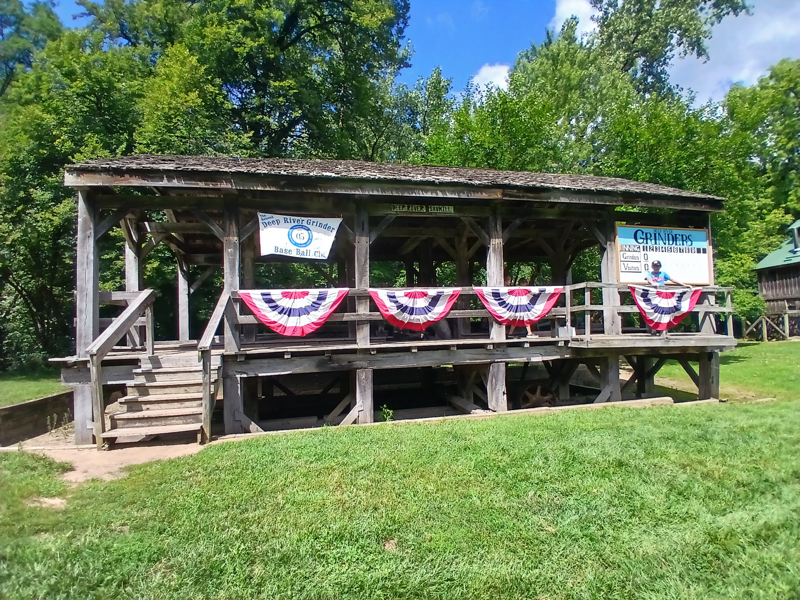 Pre-introductions, I took a walk out to the outfield area. There I found a gorgeous barn or sugar shack with an even more gorgeous American flag draped down its facing. And behind the sugar shack was a river, where a few local boys were fishing. In roughly center field, a few local kids were manning the manual scoreboard. Everything connected to the game on the field keeping to the vintage theme. Just so interesting…
