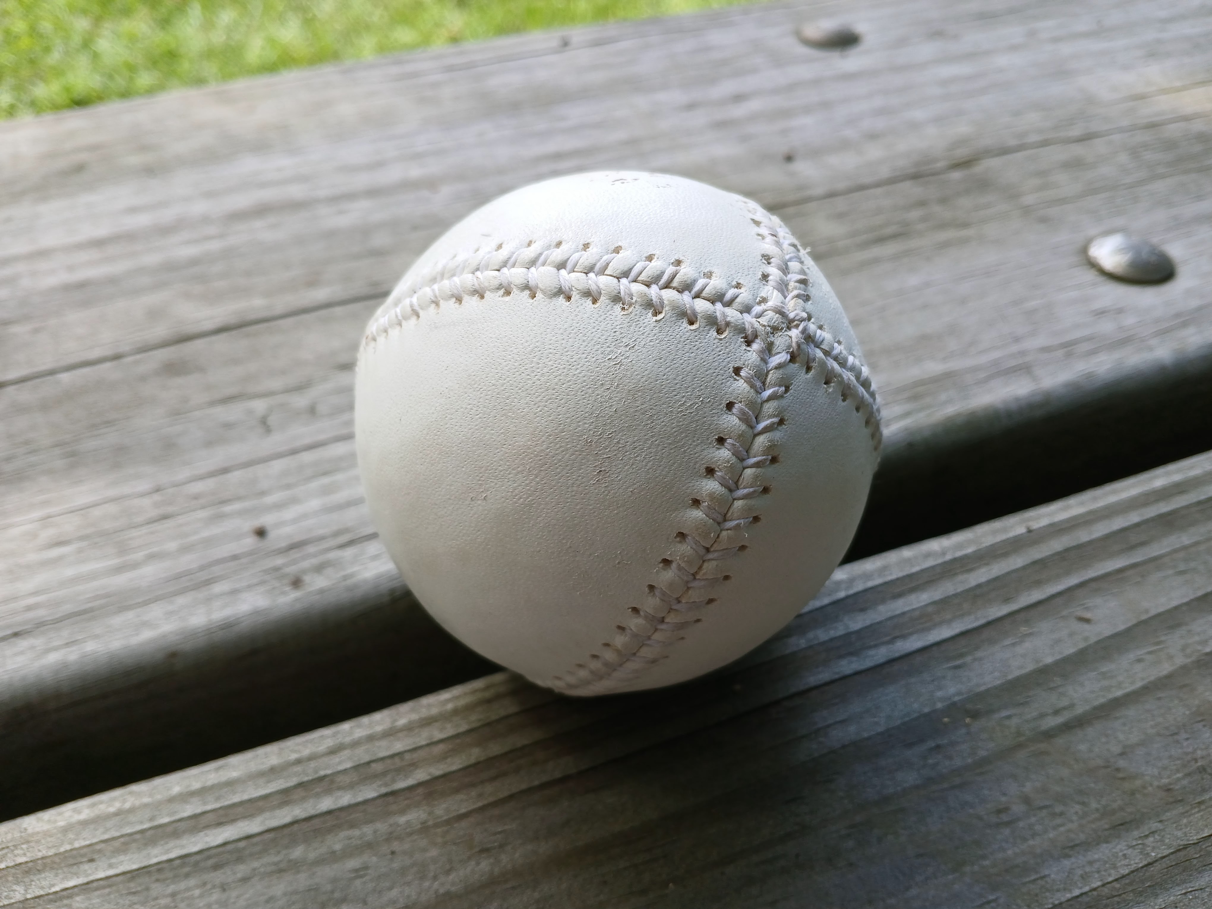 I made my way down the third base side of the field, passed the two dugouts of players, and over to what I imagine was the visitor’s side. The two teams, the Deep River Grinders and the visiting Vermillion Voles, were mixing it up, chatting with each other, chatting with fans, chatting with the umpires, and getting ready for the pre-game introductions. I sat down at a picnic table and chatted with a few of the Vermillion Voles fan section, who had traveled nearly 3 hours to get to the game that morning. I had a few questions about the baseball being used and a Voles player tossed me a game ball. Here is a close up of it. I would equate its makeup as about the same size of a baseball but with the composition more of a tee ball or lacrosse ball.