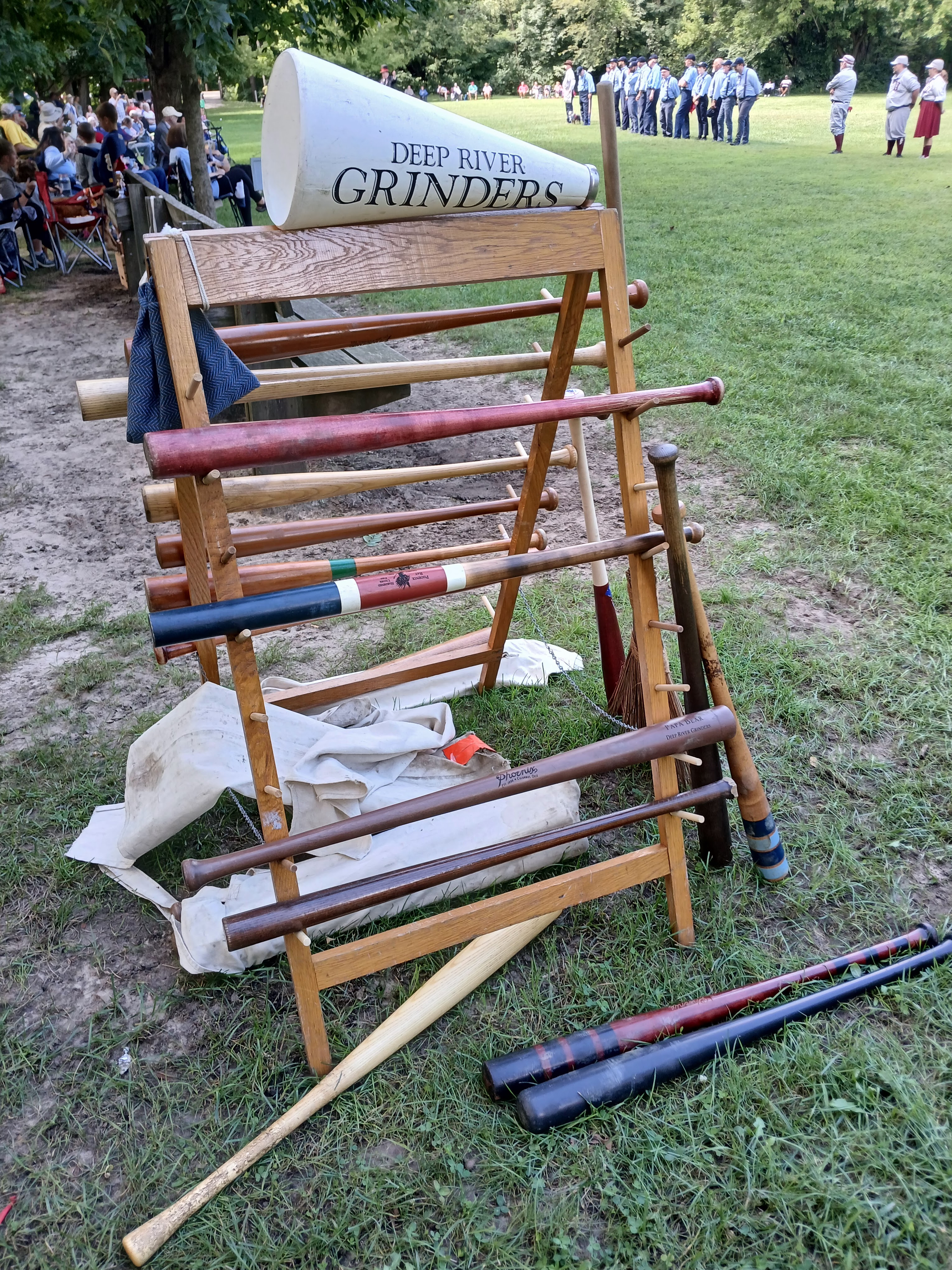 And here are the bats that were used in the contest. Wooden bats, period specific I am assuming, so no torpedo bats or Axe bats. You will noticed a pretty basic, no frills, no thin barrel, no expanded hitting zone type wooden bat. Here is a bat rack that was just in front of the Grinders dugout area.