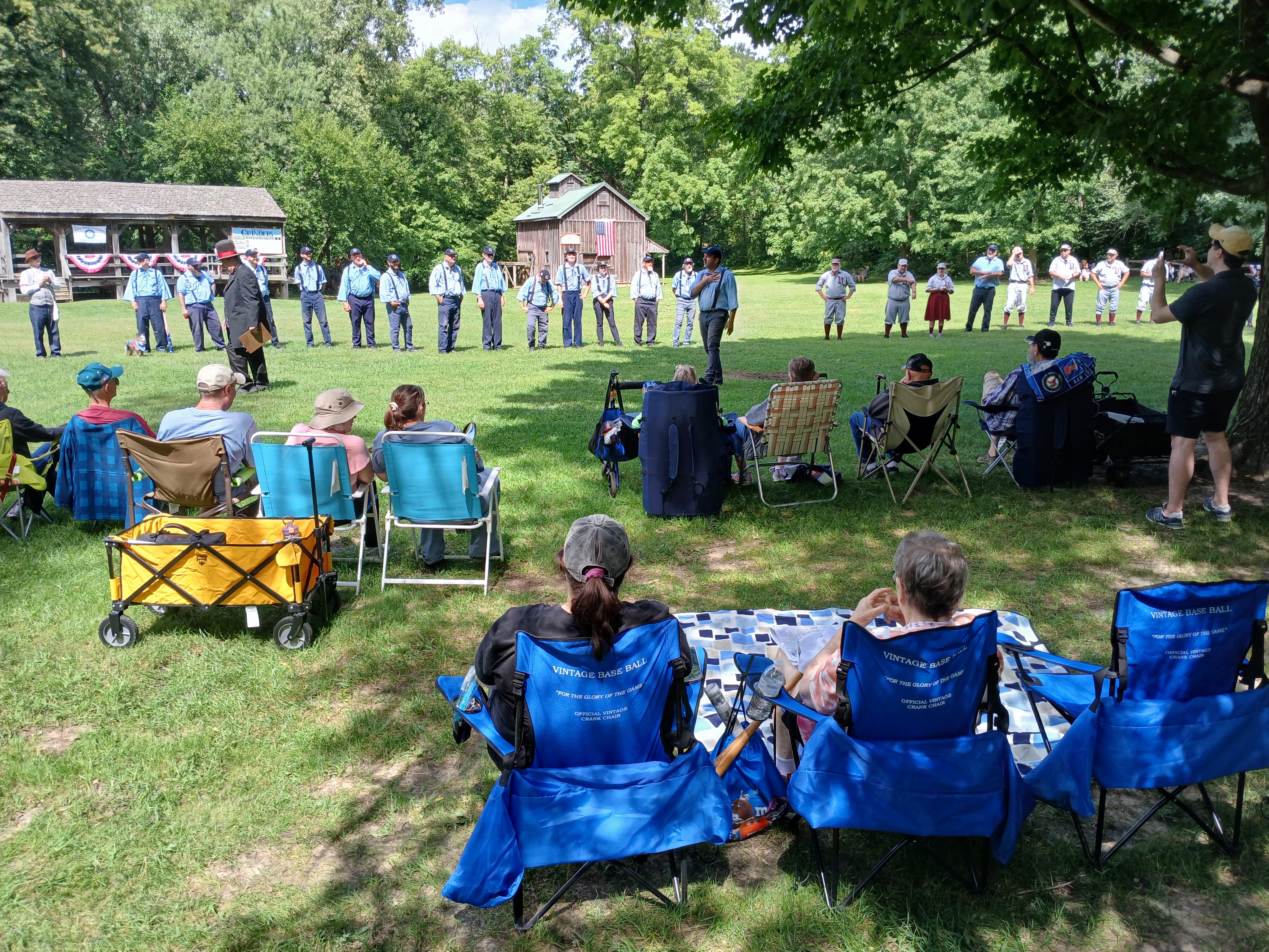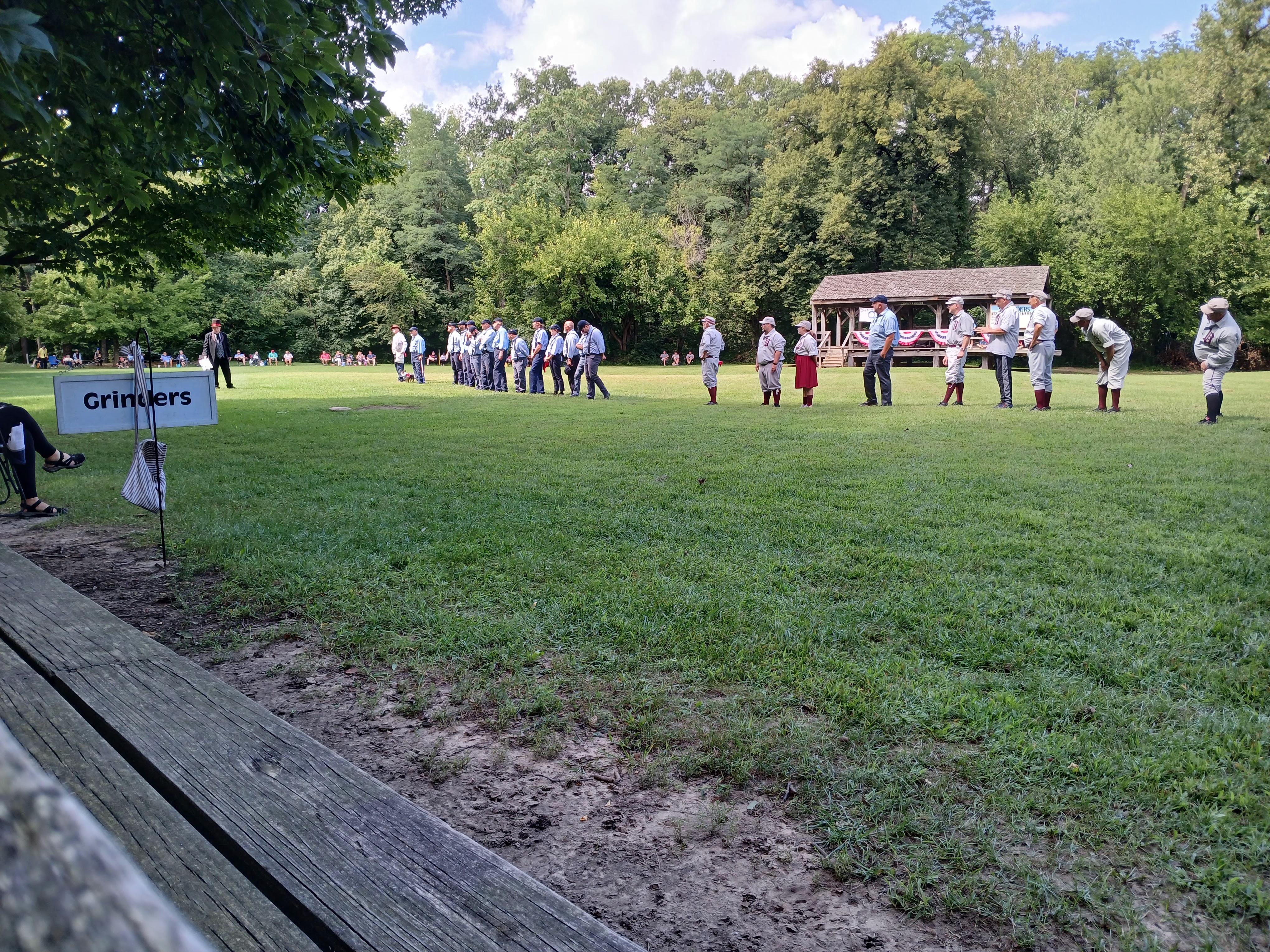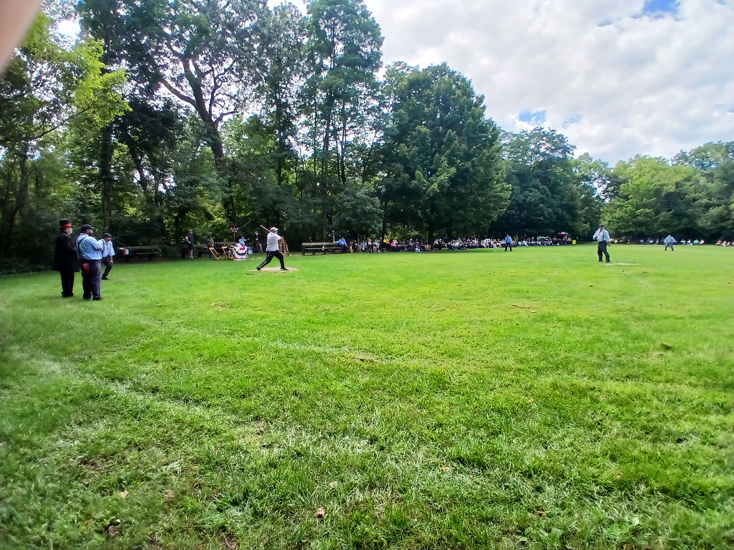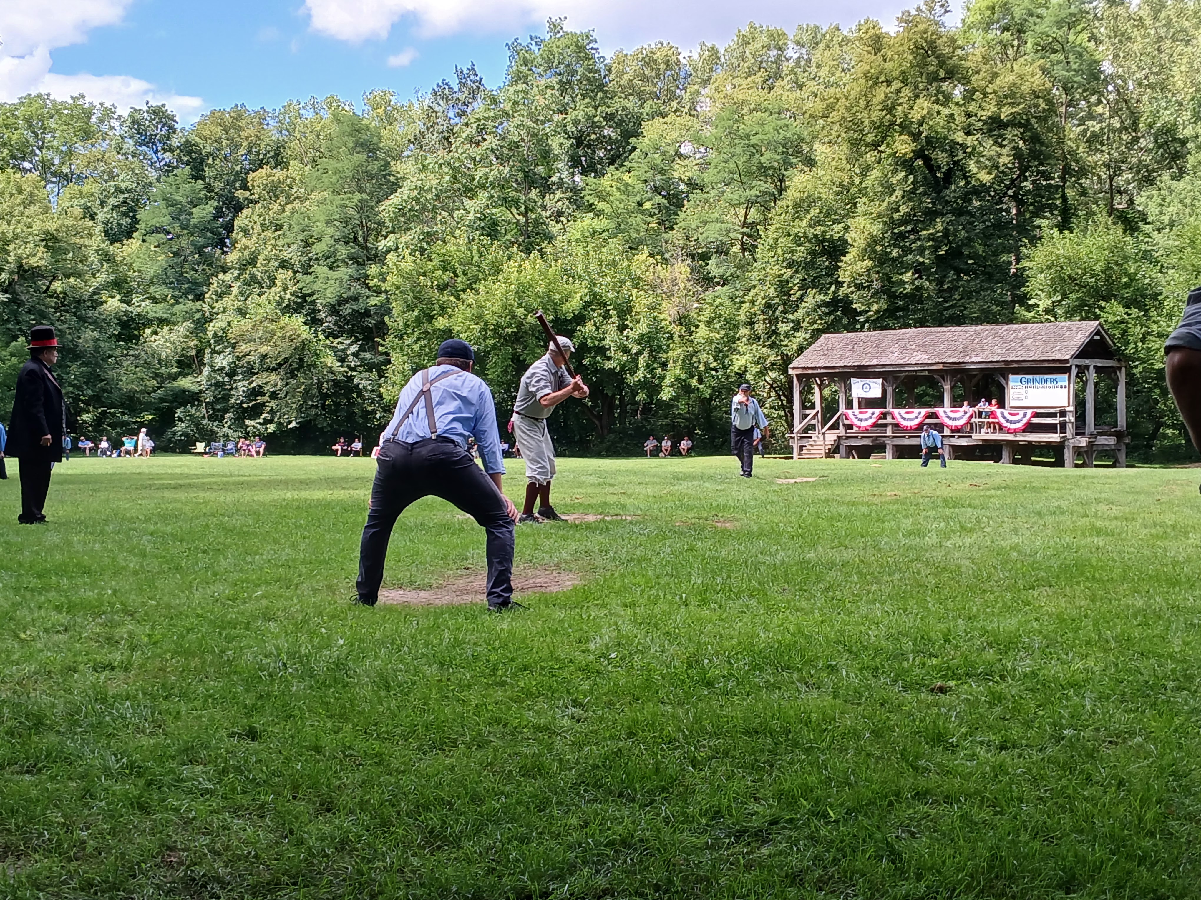 Okay, heading back toward the picnic table area I was sitting at, I noticed that the two teams began to line up in front of the fans sitting along the third base/left field area. So, I made my way over to that area to see what the fuss was all about. A stately man, wearing a tuxedo and top hat, began making game announcements. One by one, the players tipped their caps to his words and the fans cried out “huzzah” after “huzzah” along with the players. There was some good natured ribbing and some self-deprecating humor and a ton of full belly laughs from the very much entertained crowd. Players were dressed in period style uniforms and looked every bit like the 1860s style they were looking to replicate. After a few announcements, each player introduced him/herself to the fans. And they all had hilarious nicknames, which they shouted out with glee. “Rail Splitter,” “Fireball,” “Wild Thang” “Swan Lake” – grown men yelling out their names as they stepped forward and tipped their cap to the audience. That was a lot of fun to witness.
