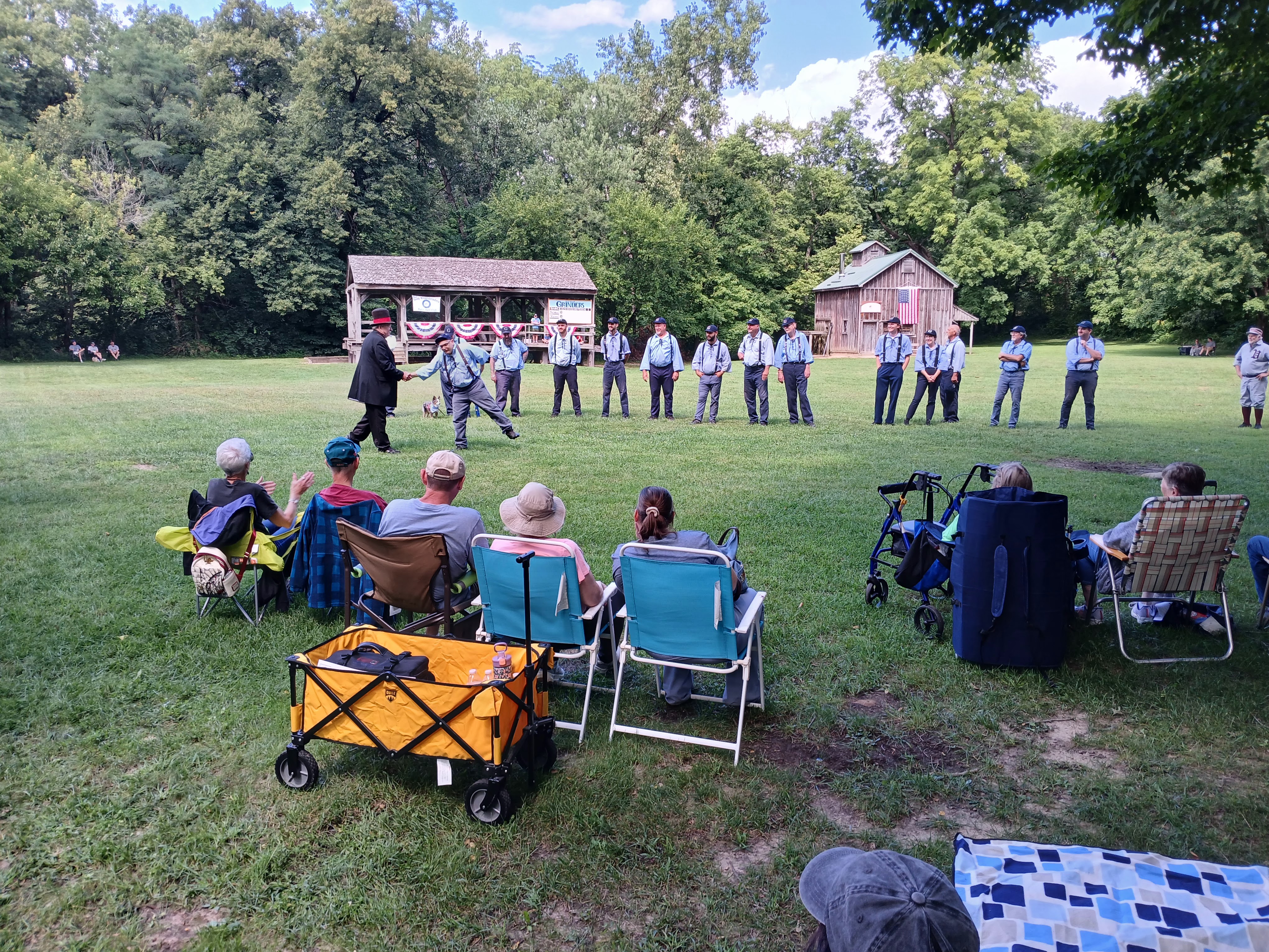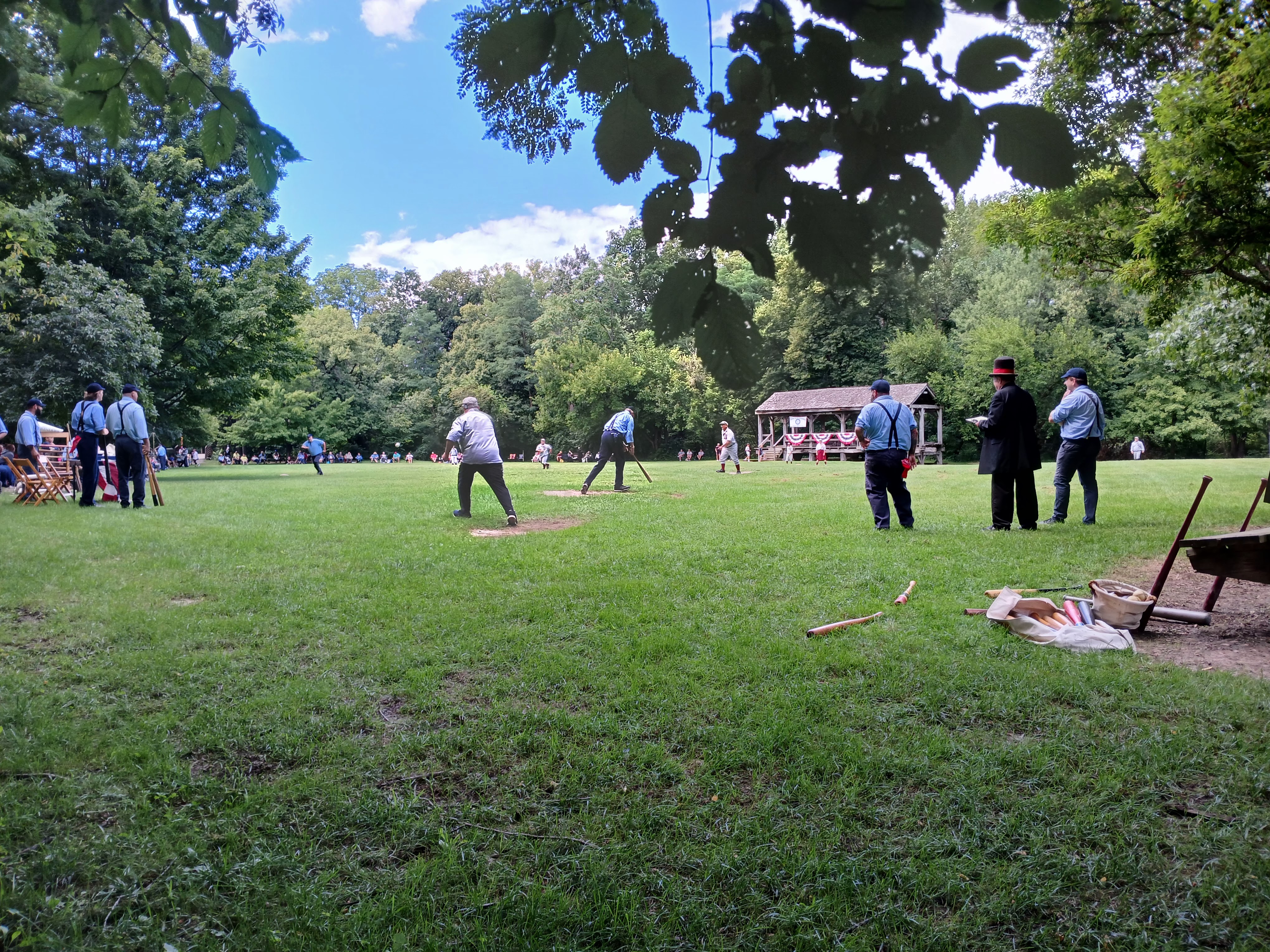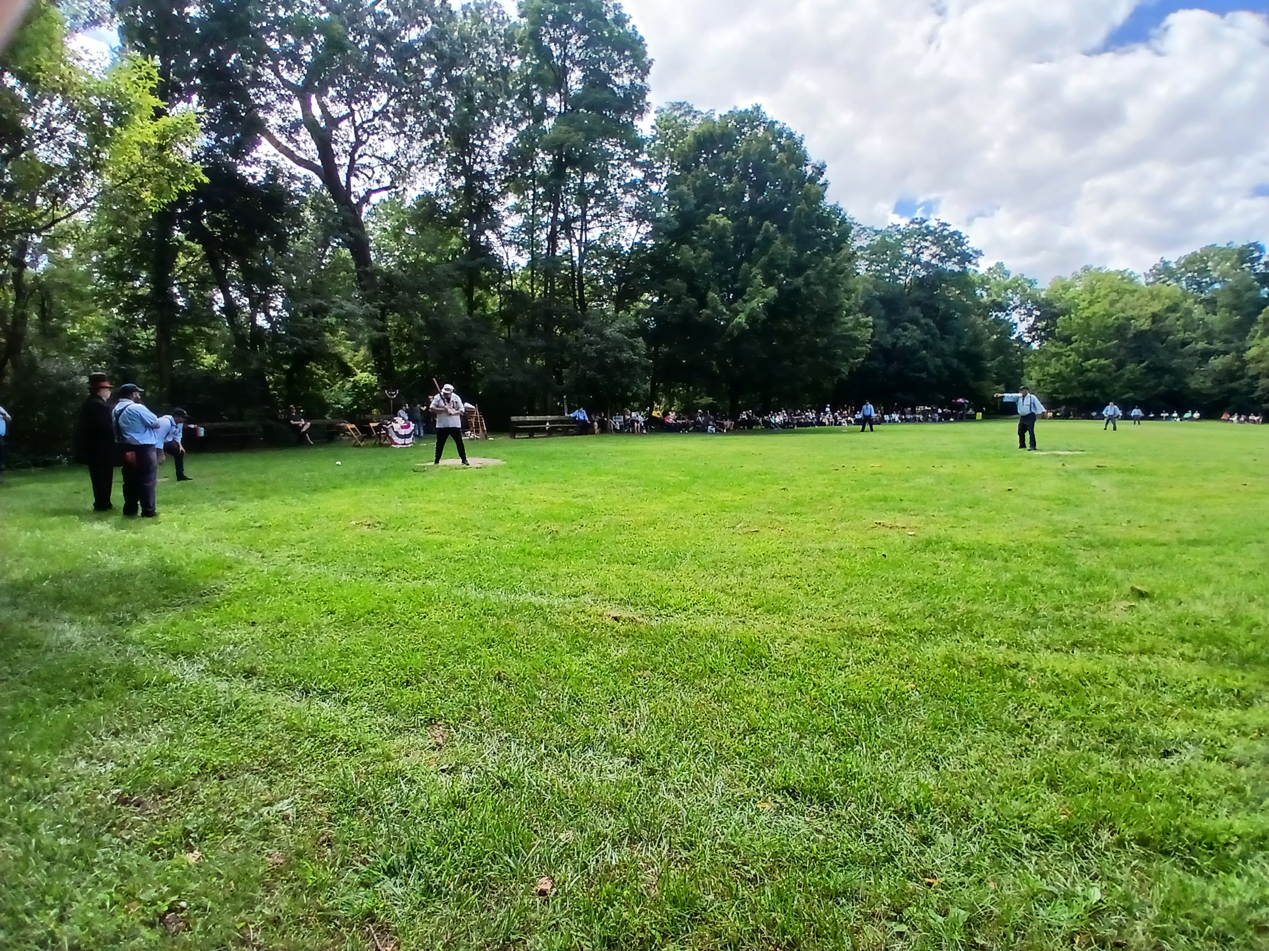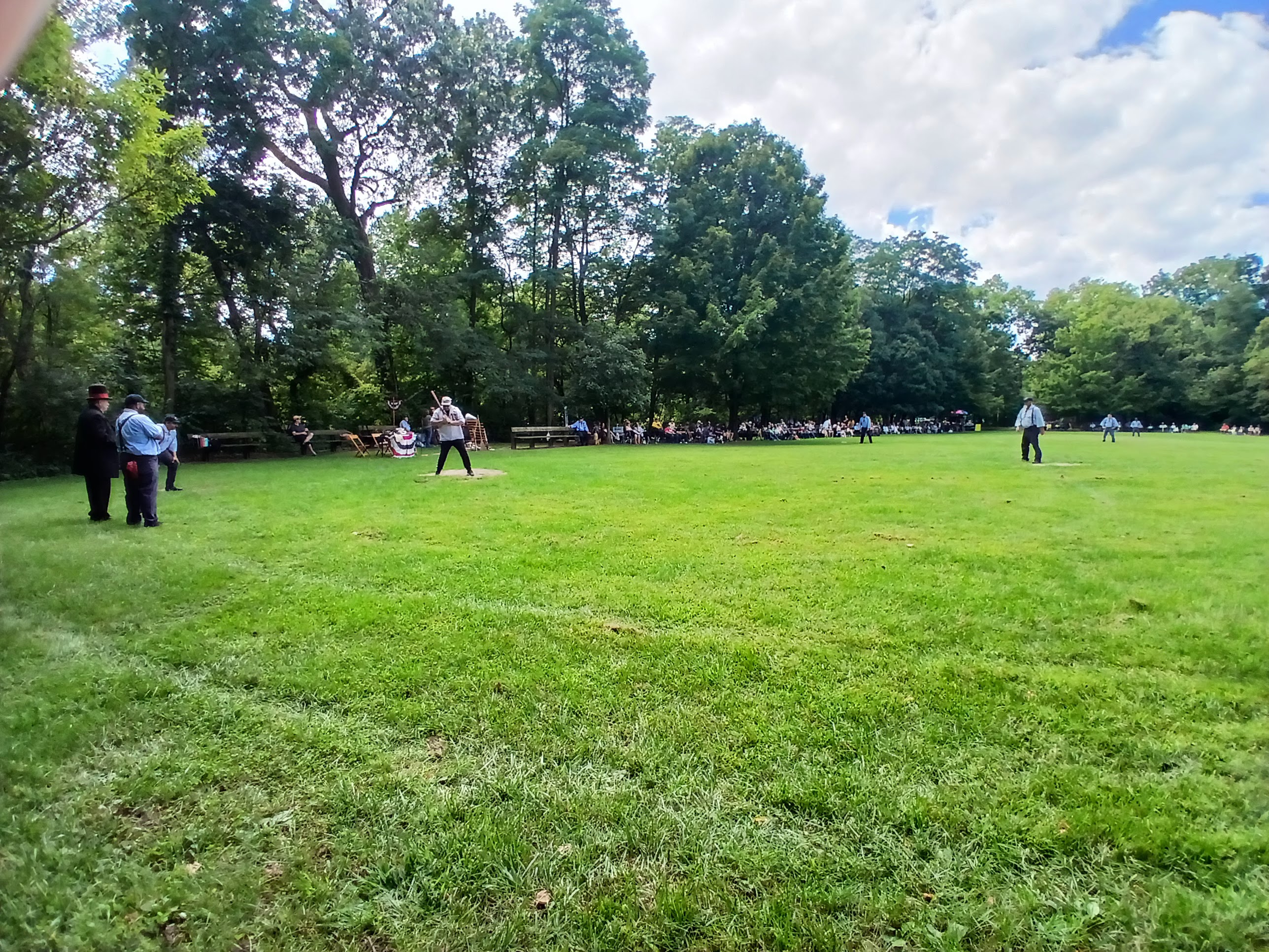 Okay, heading back toward the picnic table area I was sitting at, I noticed that the two teams began to line up in front of the fans sitting along the third base/left field area. So, I made my way over to that area to see what the fuss was all about. A stately man, wearing a tuxedo and top hat, began making game announcements. One by one, the players tipped their caps to his words and the fans cried out “huzzah” after “huzzah” along with the players. There was some good natured ribbing and some self-deprecating humor and a ton of full belly laughs from the very much entertained crowd. Players were dressed in period style uniforms and looked every bit like the 1860s style they were looking to replicate. After a few announcements, each player introduced him/herself to the fans. And they all had hilarious nicknames, which they shouted out with glee. “Rail Splitter,” “Fireball,” “Wild Thang” “Swan Lake” – grown men yelling out their names as they stepped forward and tipped their cap to the audience. That was a lot of fun to witness.