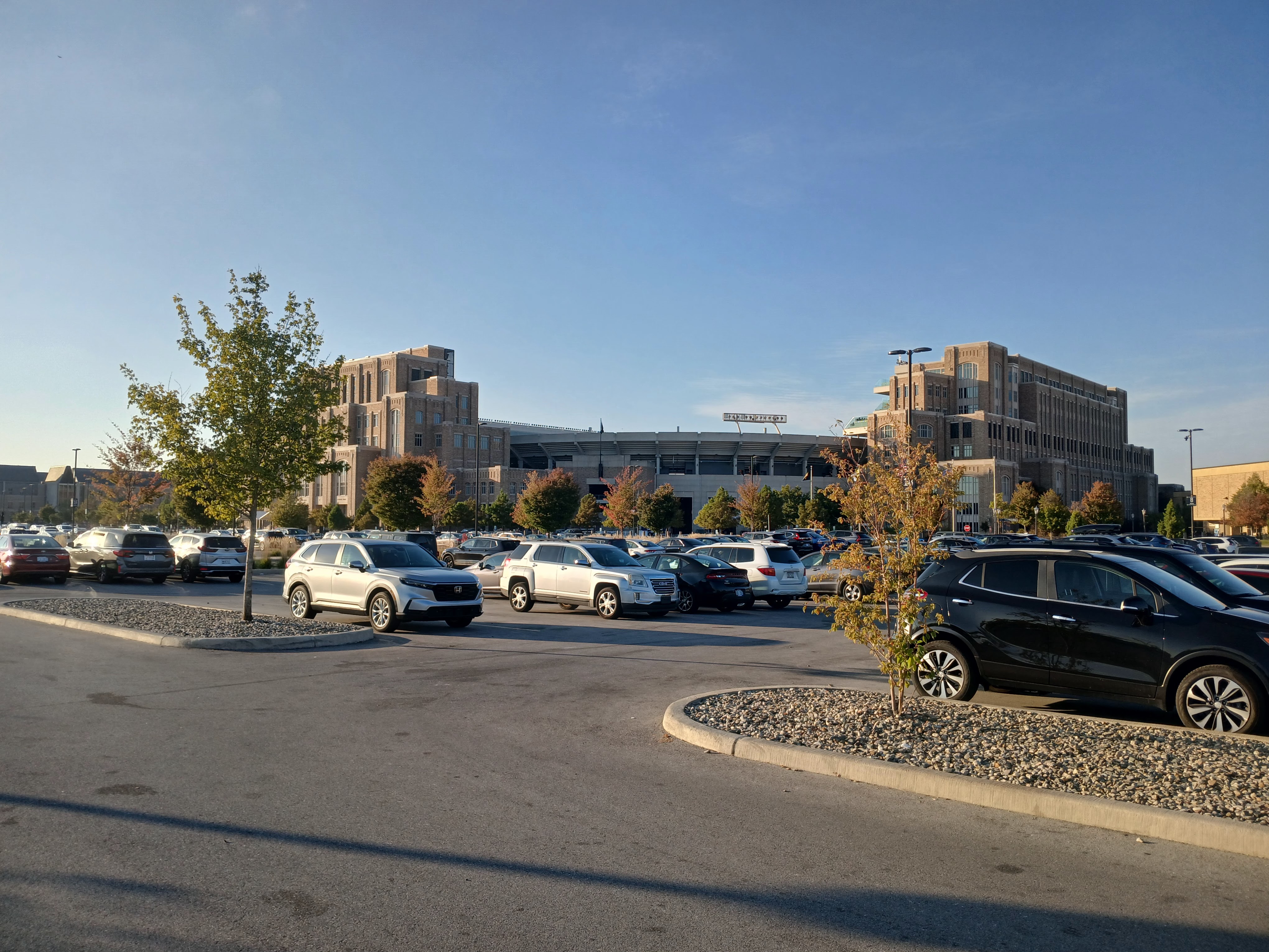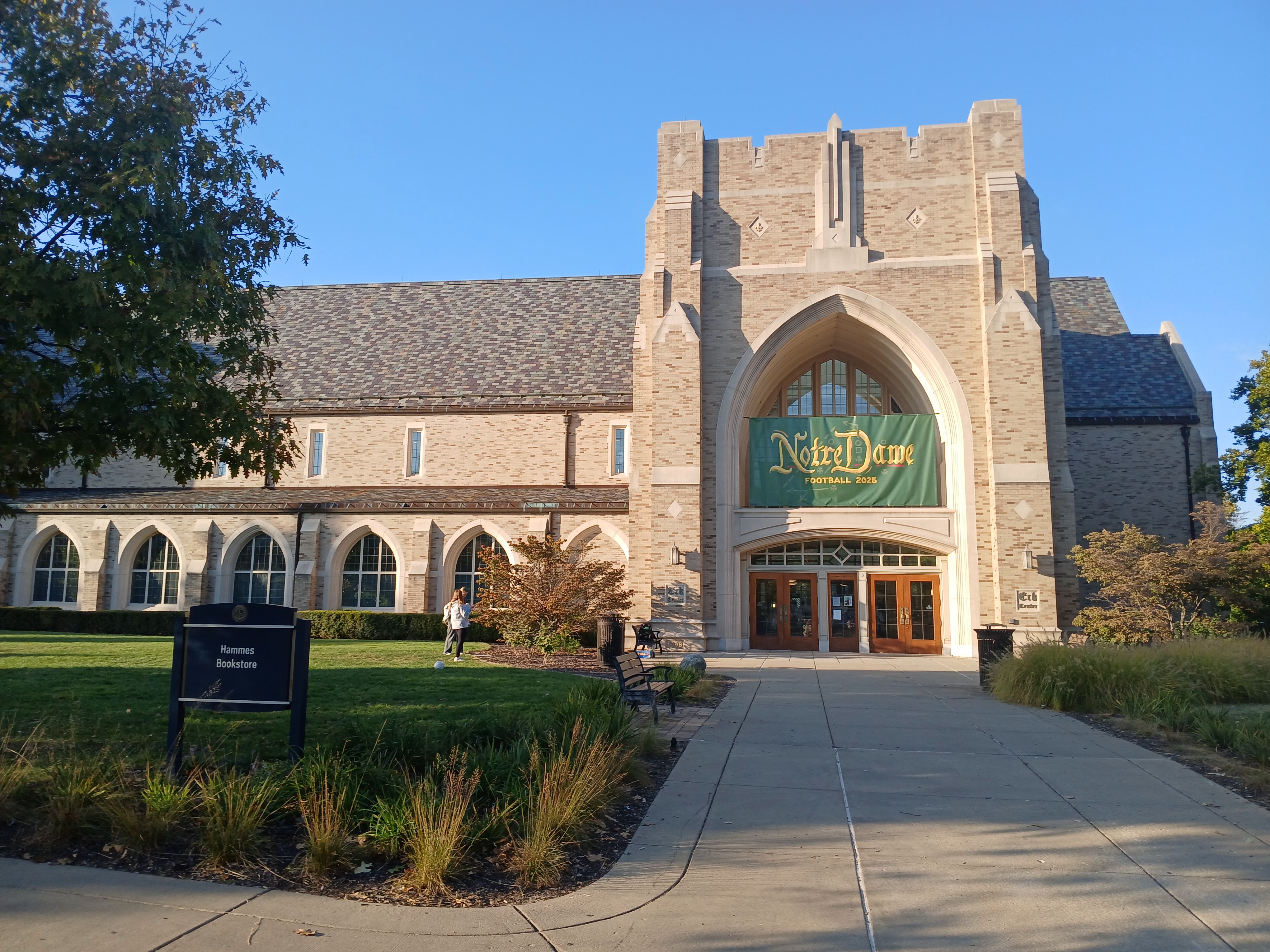 So I was out in the Chicago area again this week for business (ArcBest) and had some personal time to explore some local baseball experiences. And with my sights set on visiting Notre Dame for some time now, I took the opportunity and the drive east on Tuesday afternoon from my hotel in Schererville, Indiana to the City of South Bend, Indiana. I had done some research on parking and visitors passes and had pinpointed the Eck Visitors Center as my GPS destination. After traveling through the farms and corn fields of Indiana for about 80 miles or so, and crossing over from Central to Eastern Standard Time, I arrived just before the sun was setting at the Notre Dame bookstore parking lot and Eck Visitors Center.