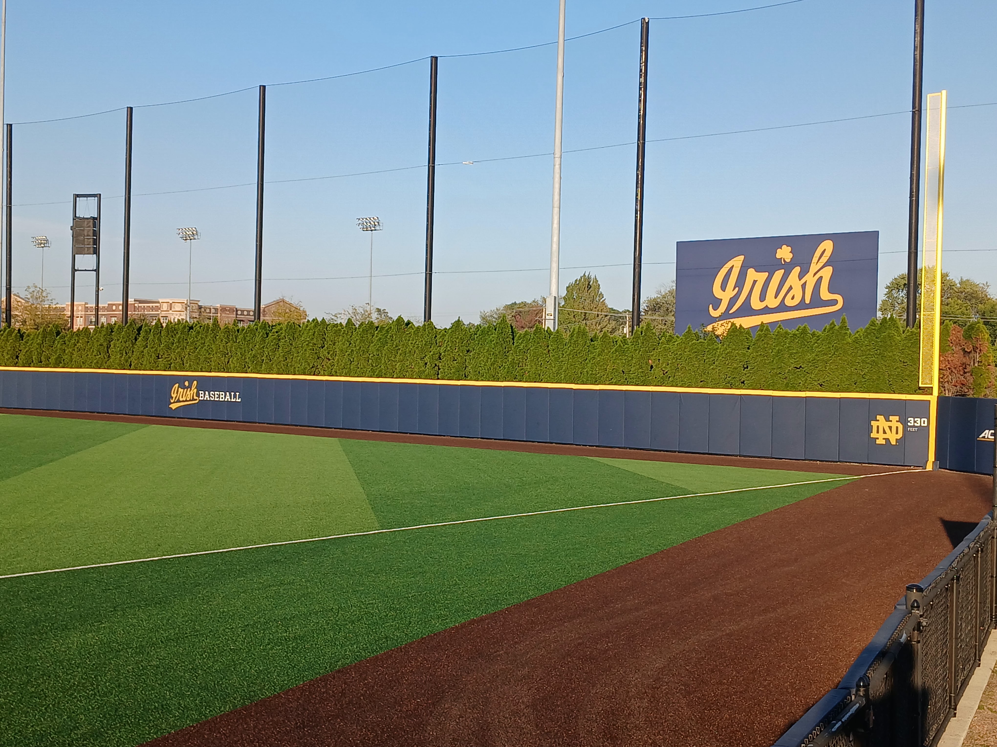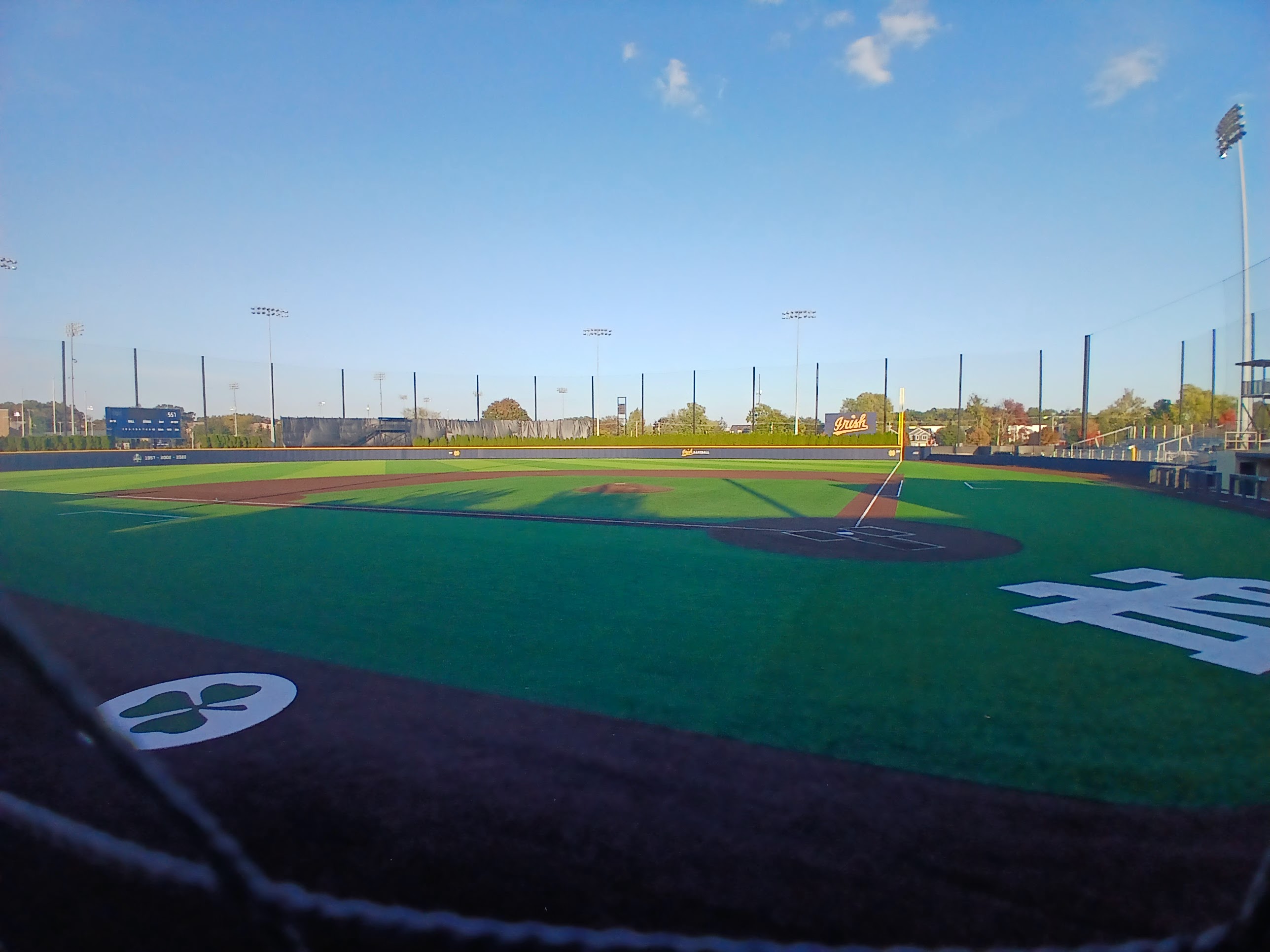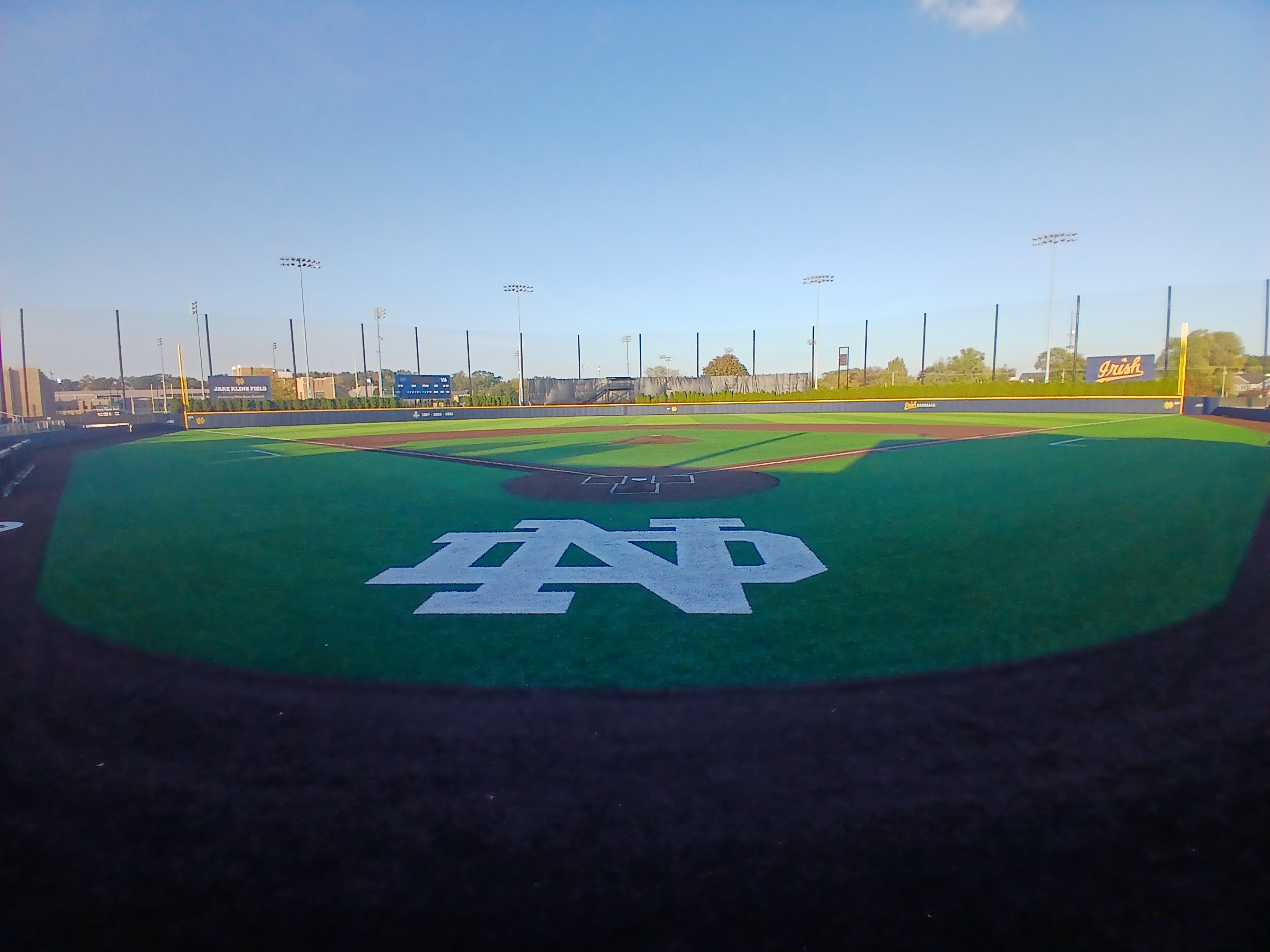 The hype lived up to and exceeded my expectations the moment I walked onto the campus of Notre Dame University. The buildings, the quad area, the bookstore, the stadiums, the fields, the tributes, the aura of greatness and excellence – they all surpassed what I imagined would be an incredible experience. I was so psyched that I found parking and could walk a short distance to the baseball field to take in some of the Notre Dame campus experience. The football stadium, the baseball stadium, the athletic complexes were just so impressive top to bottom. I was over the top thrilled that there was a gate open for me to take a small look inside Frank Eck Stadium and view the amazing Jake Kline Baseball Field. I did hustle because my parking spot time was limited, the sun was setting so my photo opportunities were limited, and I still had about a 2 hour or so ride back to my hotel. However, I did my very best to just be in the moment, be in the Irish moment, and wow did I have a few moments there at Notre Dame. Overall, it was an incredibly memorable afternoon visit and South Bend experience to the historic Notre Dame University and its Jake Kline Baseball Field at Frank Eck Stadium.