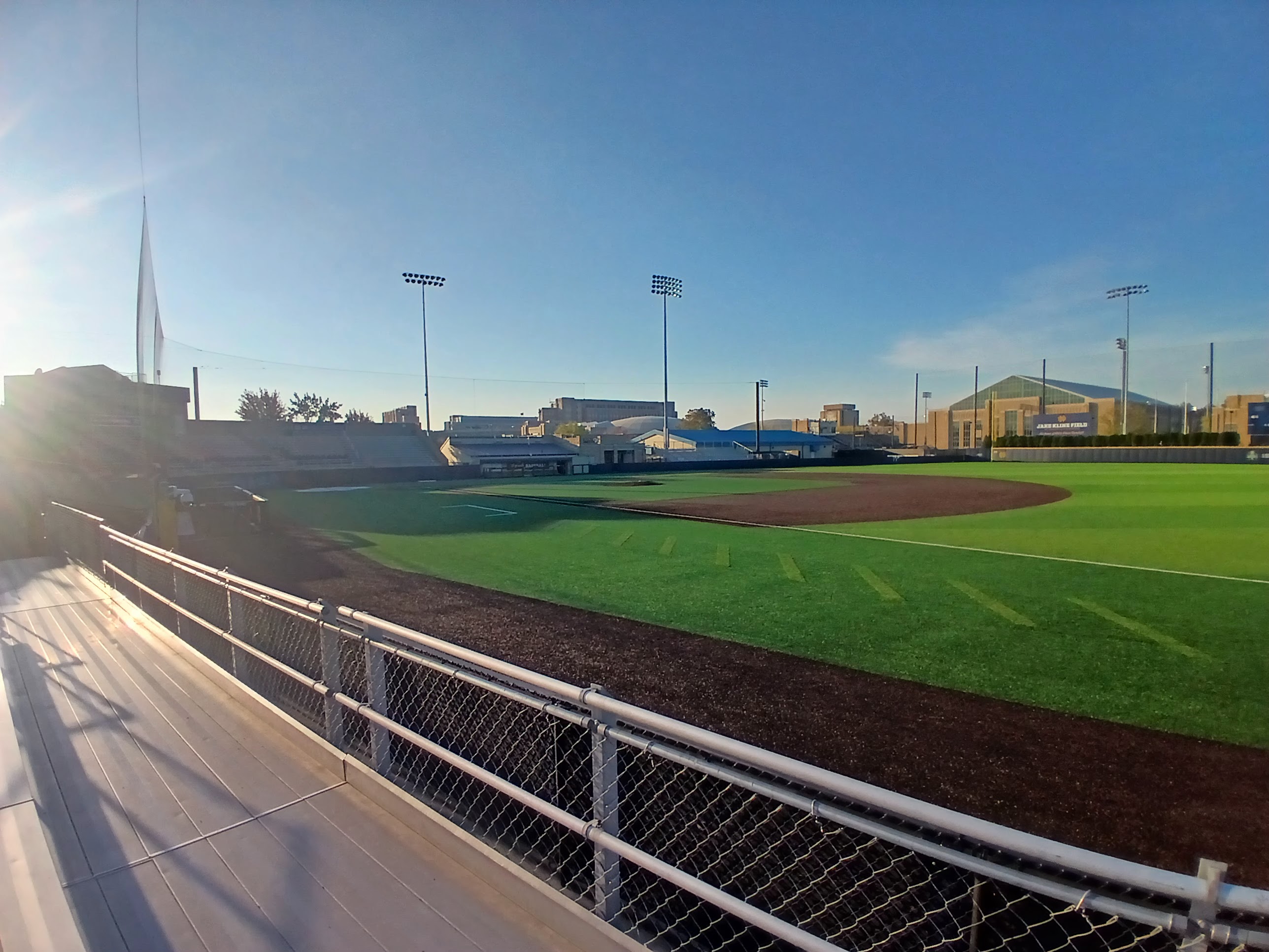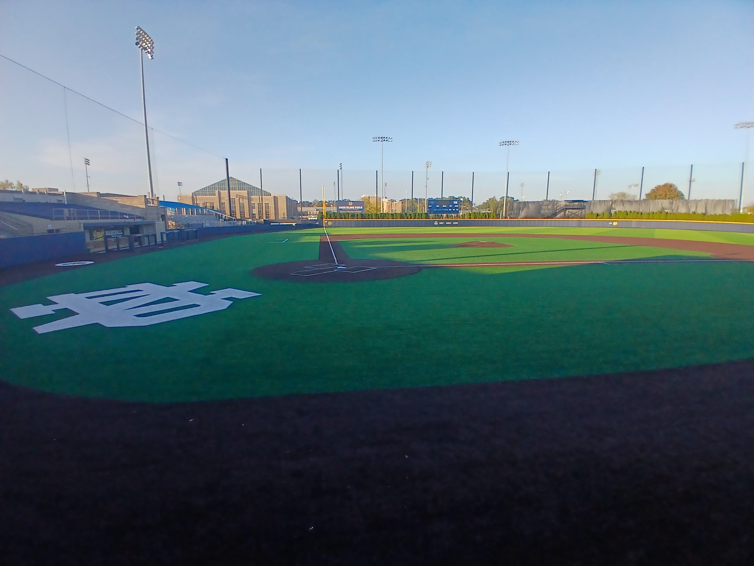 Honestly, there was a ton of amazing and famous Notre Dame buildings and statues to see and I sort of felt guilty not stopping at each and every one. But, time was not on my side, as the sun was setting pretty quickly at around the 5:00pm mark. I took a few photos of the ticket booth area of Frank Eck Stadium and learned that the field was named “Jake Kline Field.” Jake Kline was the ND Baseball coach for some 40 plus years (1934-1975) and is the program’s winningest coach. I wasn’t expecting any gates to be open but was super excited when I walked towards the first base line and saw a gate wide open for me. Maybe it was the luck of the Irish, maybe it was just open. I’ll say it was the luck of this Irishman because I had a chance to tour the field, the bleachers and get a glimpse of how special Jake Kline Field is.
