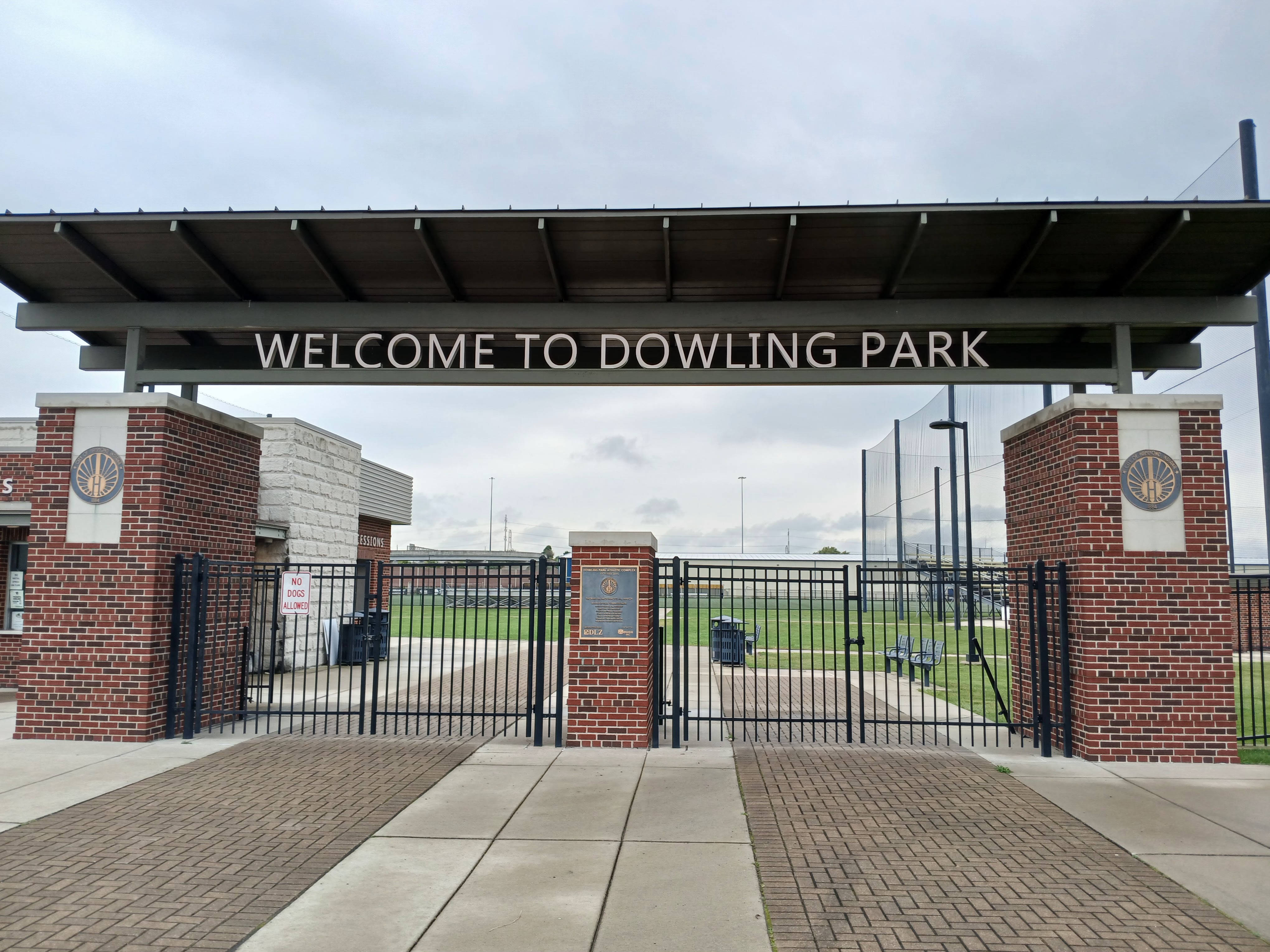 After parking in the lot next to the baseball field, I noticed a group of softball players practicing on an adjacent field to the baseball field. It had rained overnight and the field and grounds were still a bit wet. I made my way over to the front gate entrance of Dowling Park and noticed an open gate, so I walked through it and over to the baseball field. Nice looking field – all turf except for the pitcher’s mound. I took my usual stroll around the backstop and headed out to the left field area to see if I could spot any cool Purdue Northwest tributes or statues or retired numbers.