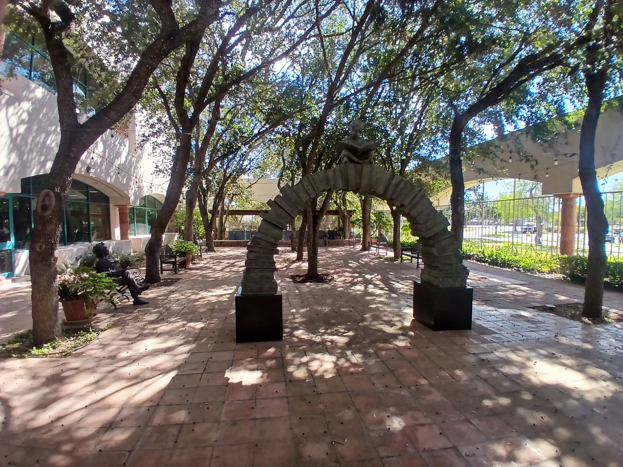 After returning to my rental and realizing I still had time for a quick bite, I stopped back at my hotel for a coffee and a snack before heading over to the Harlingen Public Library. When I finally made it to the library, the gates were wide open and I walked into a beautiful courtyard with some really cool bronze statues, reading benches, and draped lights on trees lining the area. Wow, what a cool first impression.