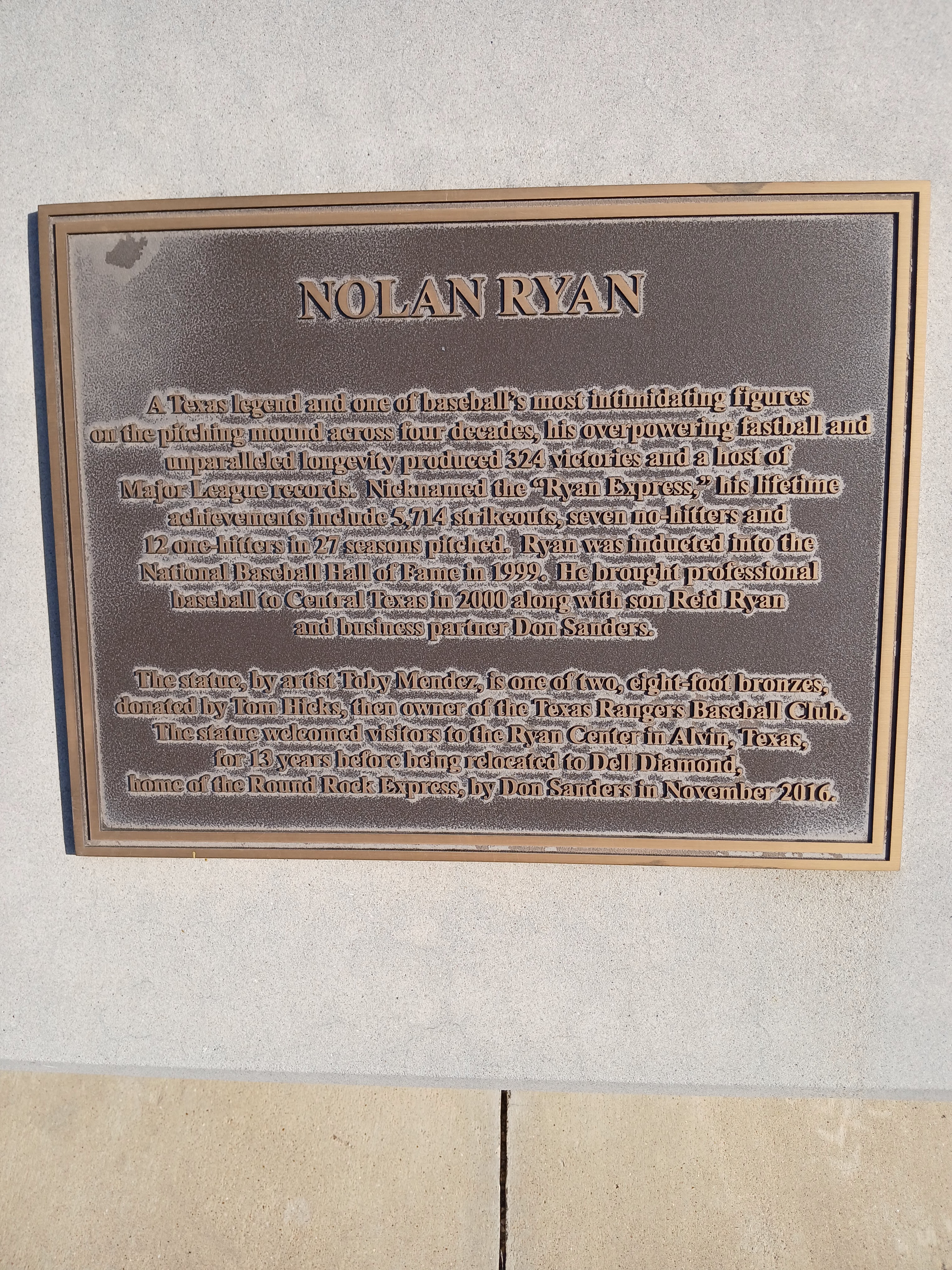 If you haven’t figured it out by now, I am sort of fan-obsessed with Nolan Ryan. I told this story to Mike Coffin of the Corpus Christi Hooks, that I jokingly informed my Mom (at roughly age 10) that when I turned 18, I wanted to change my name to Nolan Ryan Roby. That never happened obviously but the fan obsession with Nolan Ryan remains for me. Ryan was a larger than life baseball player with a blazing fastball and tough as a cowboy attitude on the mound. I admired his pitching prowess and respected his ability to show up year after year and produce. Right there, in the front gate area of Dell Diamond is a statue of the one and only, Nolan Ryan.