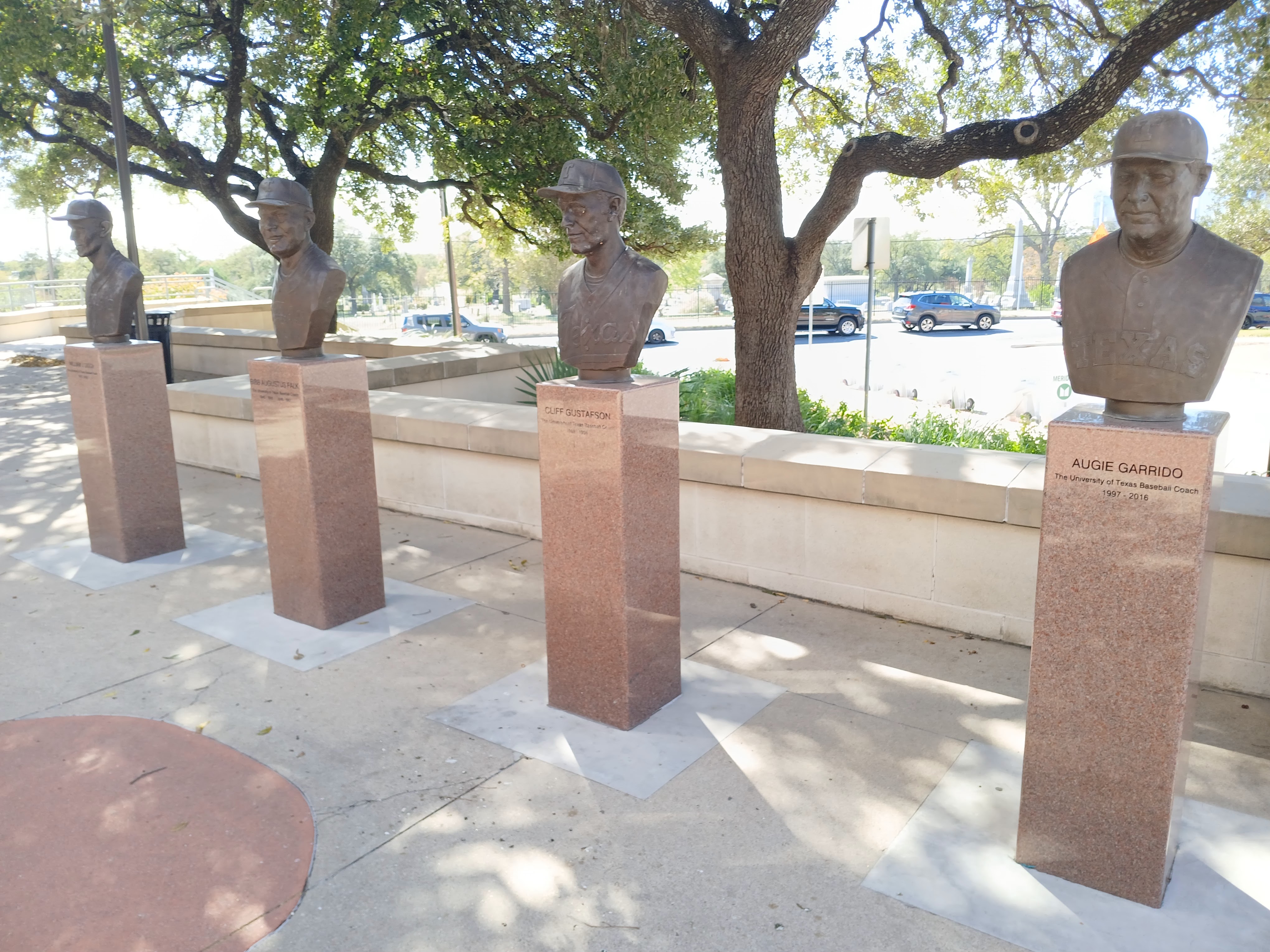 As I had one hour of paid parking, I took a second swing around the Disch-Falk Field to see if there were any retired jerseys or statues or plaques. There was a field dedication plaque on the wall near the ticket office. And I found a row of former coaches immortalized near the front gate area. Here they are: