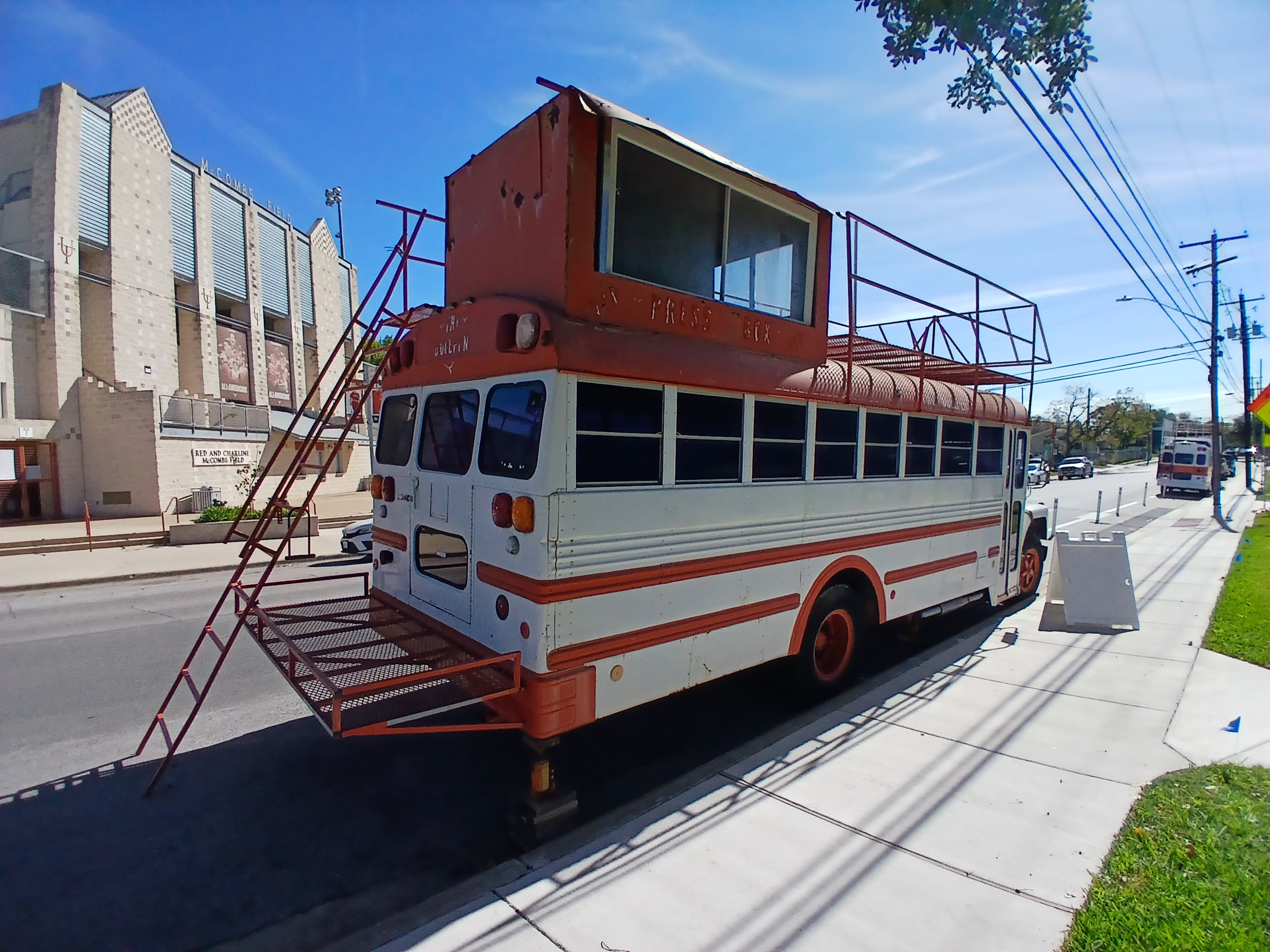 On the back side of the baseball stadium, parked conveniently next to each other were these two UT media buses. You can see the classic UT burnt orange colors dressing them up. I’m not sure what the back story is on them, but they looked cool enough to photograph and research. Both buses were equipped with a “second floor” for the camera crew and equipment. Pretty neat media transportation.