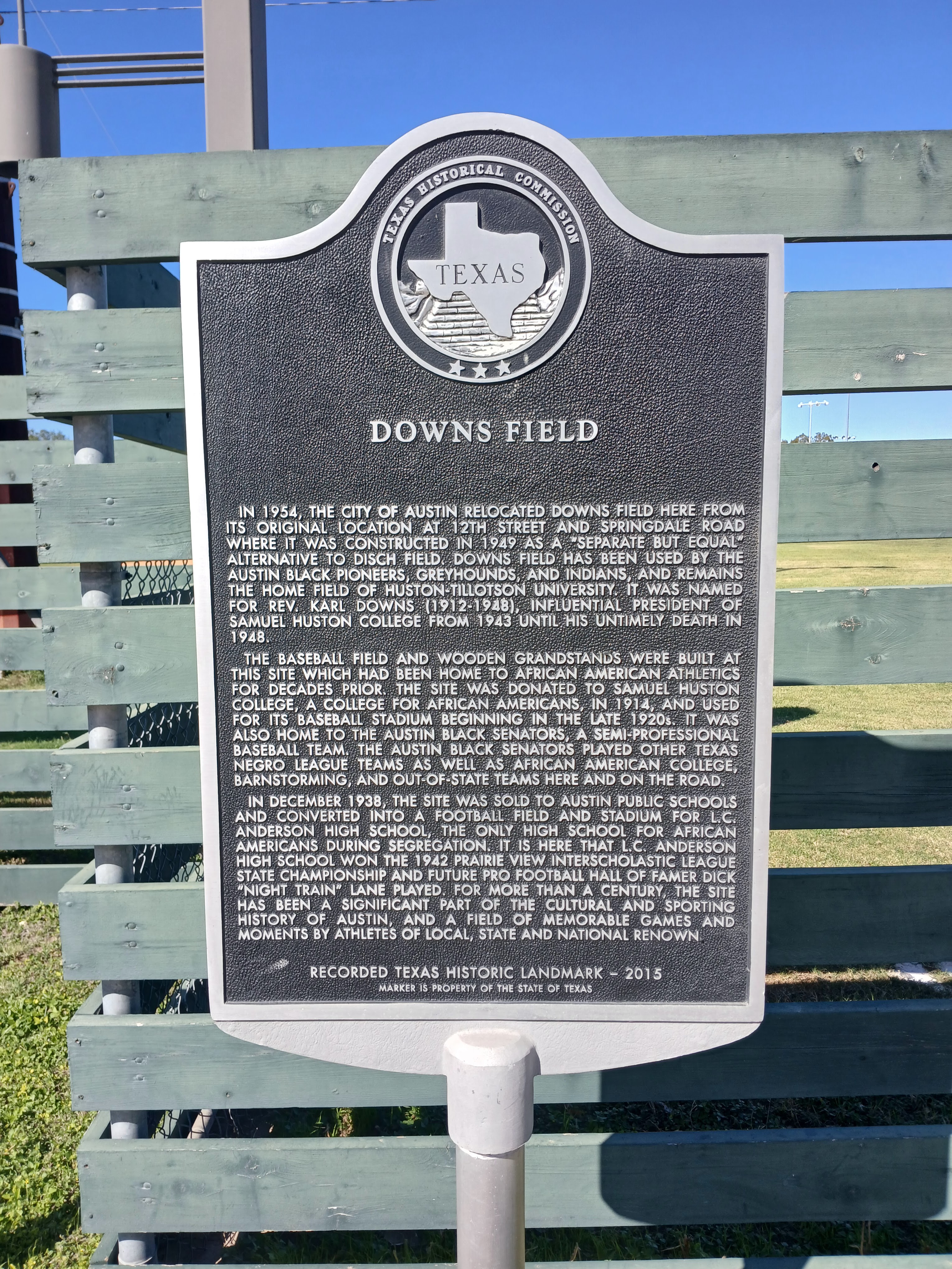 Downs Field, home of the Huston-Tillotson University baseball team. Downs Field was home to several Negro League teams in Austin and has a civil rights historical marker honoring its place in Austin history.