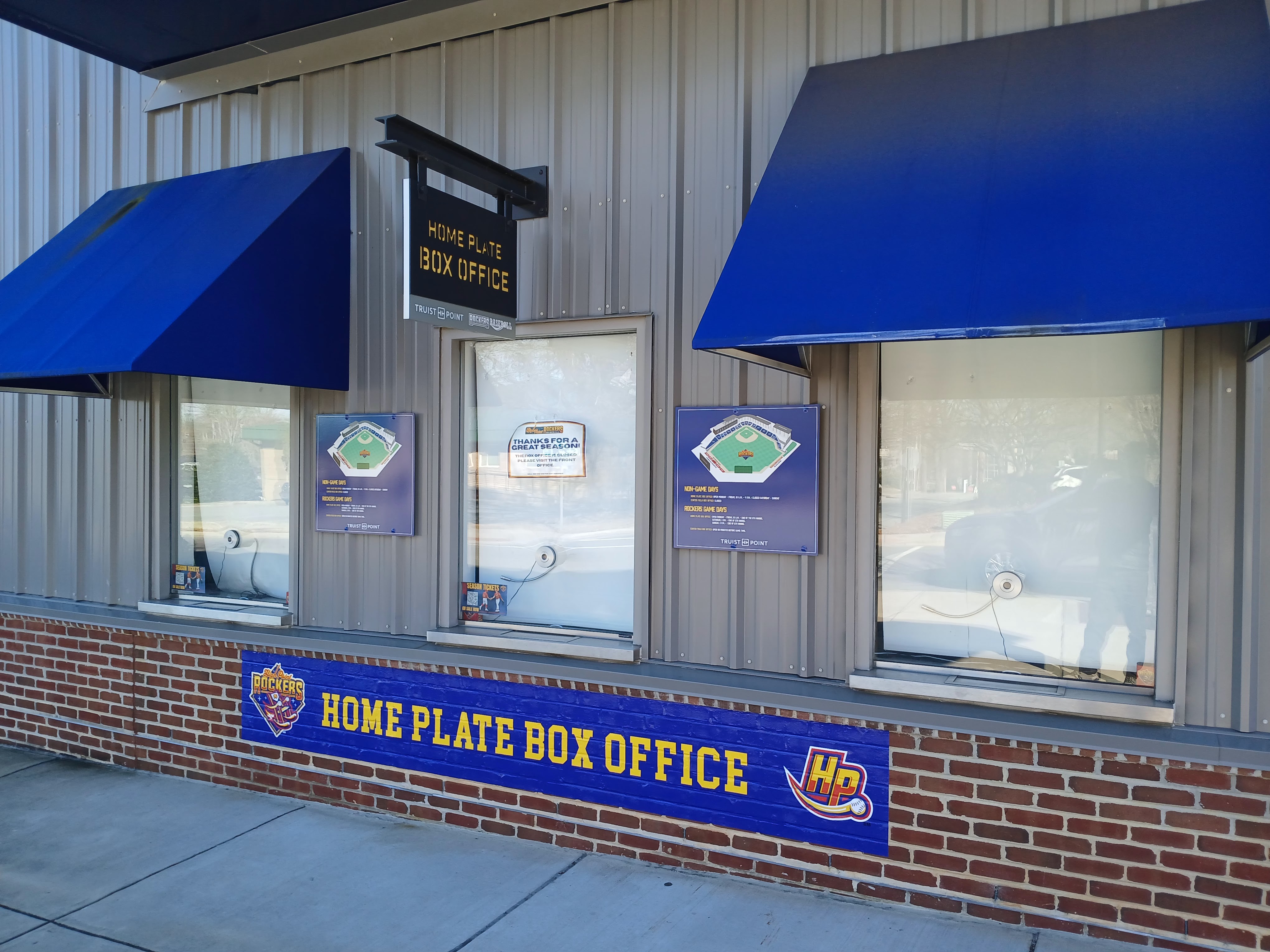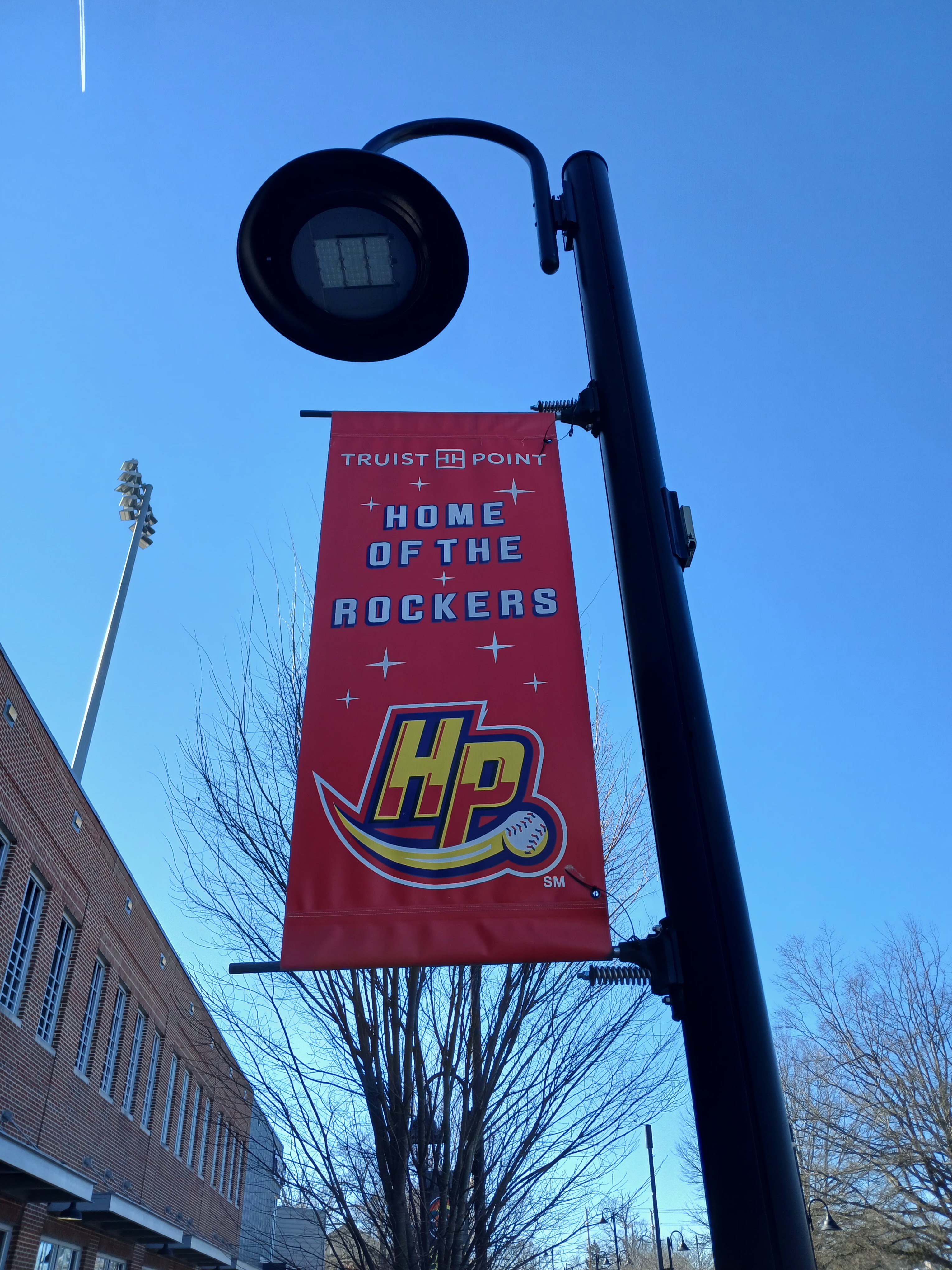 Being that it is the second week of January, I was 100% not expecting any of the baseball fields or stadiums to be open to the public. That was certainly true of my first stop – Truist Point Stadium, home of the High Point Rockers of the Atlantic League of Professional Baseball. Truist is set in a busy commercial area just off N. Main Street in High Point. The stadium has a large, shared parking lot with several businesses. I was able to walk the perimeter of the outside of Truist Point and took several photos along the way. The High Point Rockers begin their 2026 season at home, April 21st, vs. the Gastonia Ghost Peppers at Truist Point Stadium.