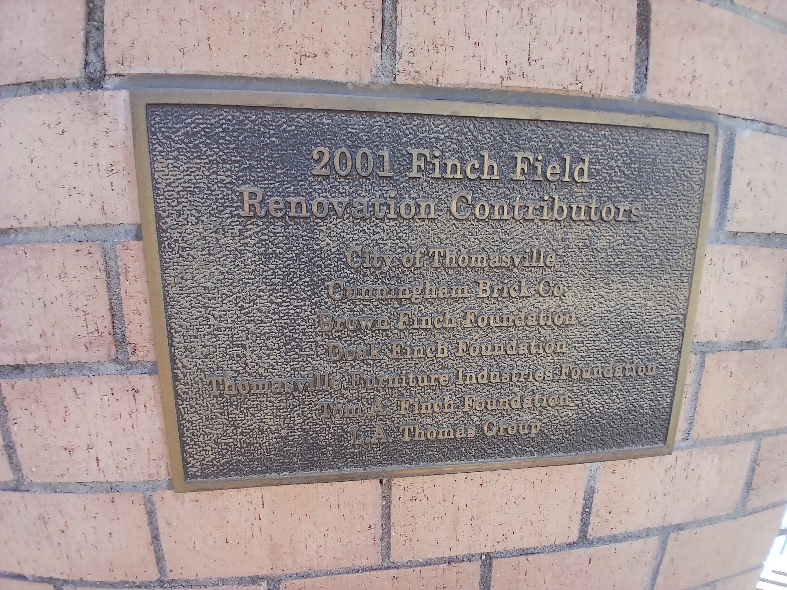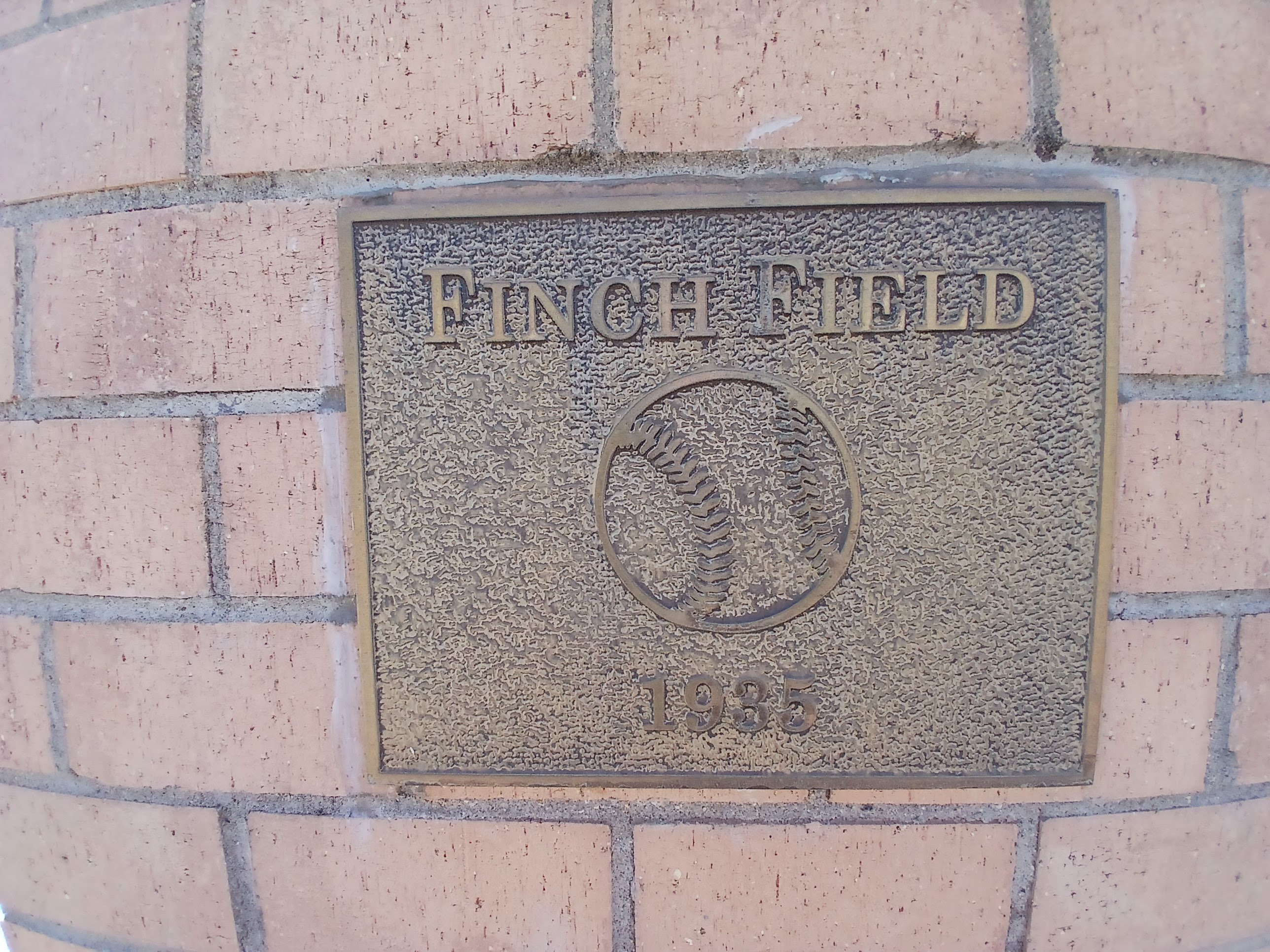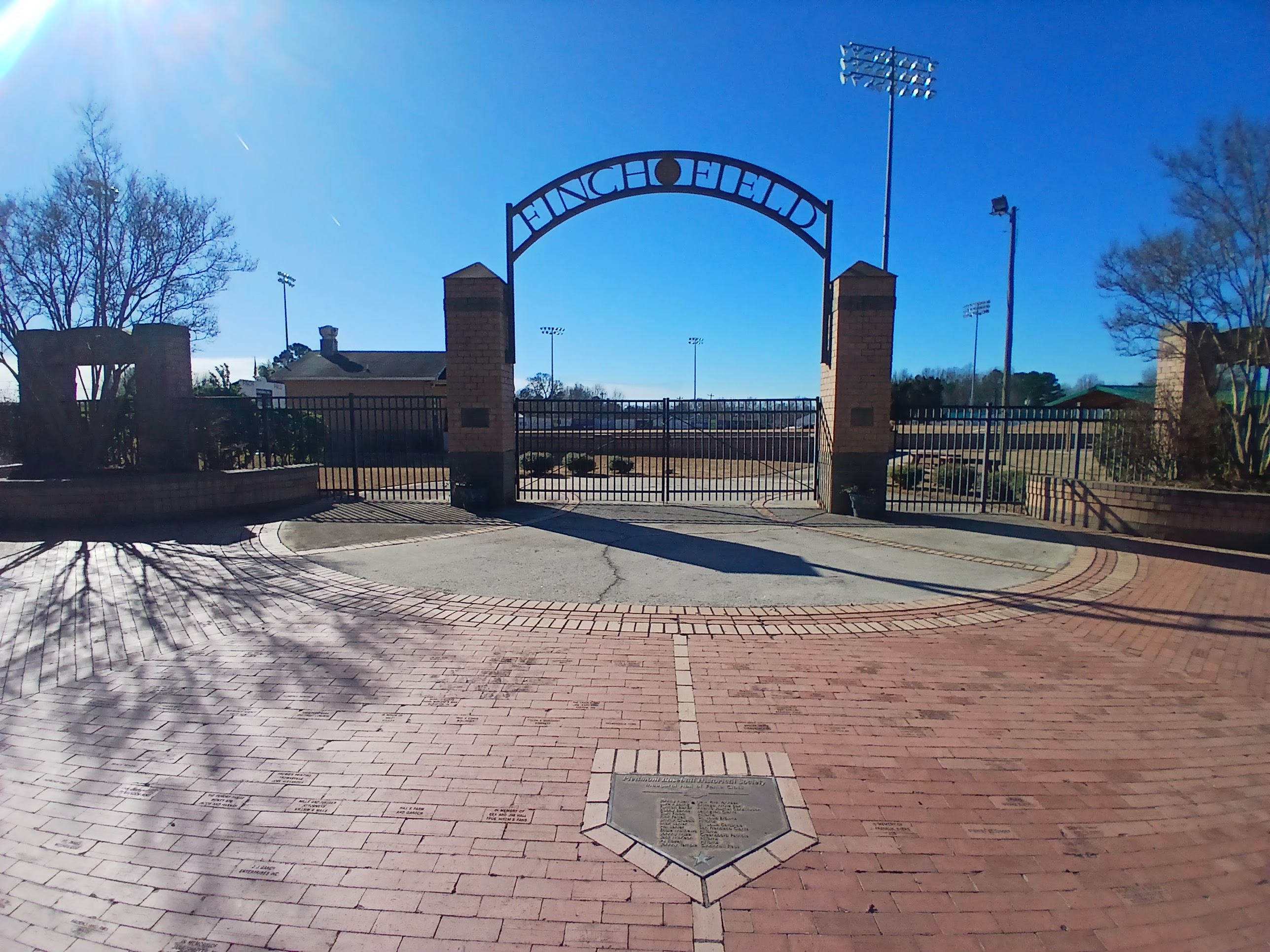 Similar to Truist Point Stadium, Finch Field was closed to the public for the season. The main gate off Ball Park Rd. (clever) was open, so I entered and found parking near the left field gate area. There at the gate were several plaques, a brick sponsorship display, and some Finch Field information.