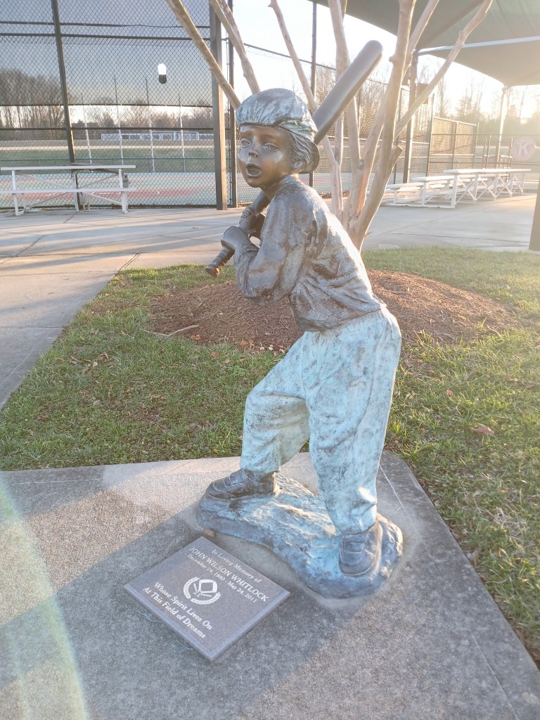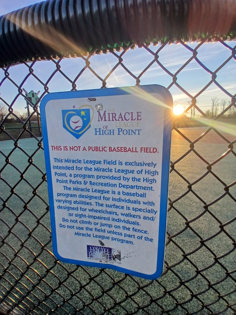 The final stop of the day before the sun set was Miracle League Field. This field, according to its signage, is intended for the Miracle League of High Point. The field surface, according to signage, is specially designed for wheelchairs, walkers, and other modalities related to persons with disability. I have seen other Miracle Fields throughout my baseball experiences and always take a moment to pay them their due. This is a great community effort and it takes a special group to run and coach baseball leagues for persons with disability. So, I tip my cat to everyone at the Miracle League of High Point.