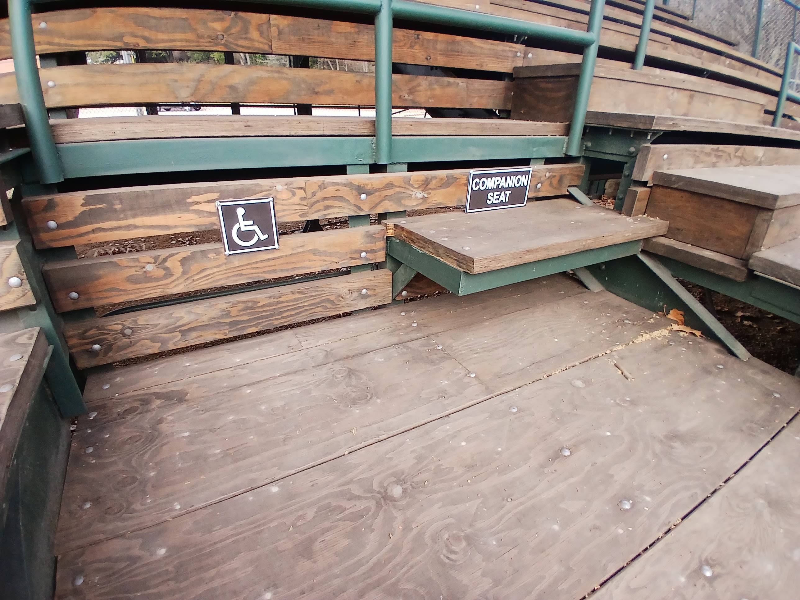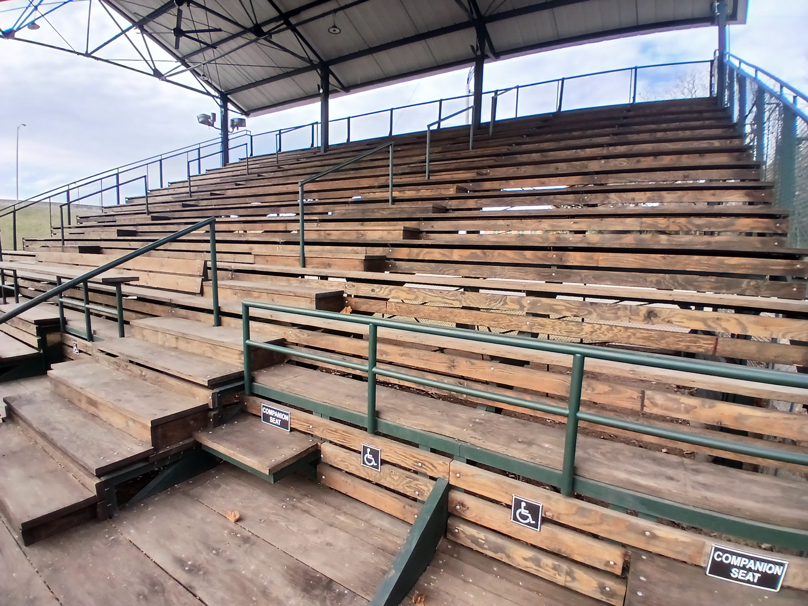 As I approached the front gate area, I noticed a City of Dallas Parks and Recreation vehicle parked on the sidewalk. And said hello to a Parks and Rec employee preparing to work on the field. The gate was locked and I asked the employee if I could enter the field to take a few photos. He unlocked the gate, we chatted for a bit, and I hustled up and into the wooden bleachers to snag a few views and some photos of Reverchon Park.