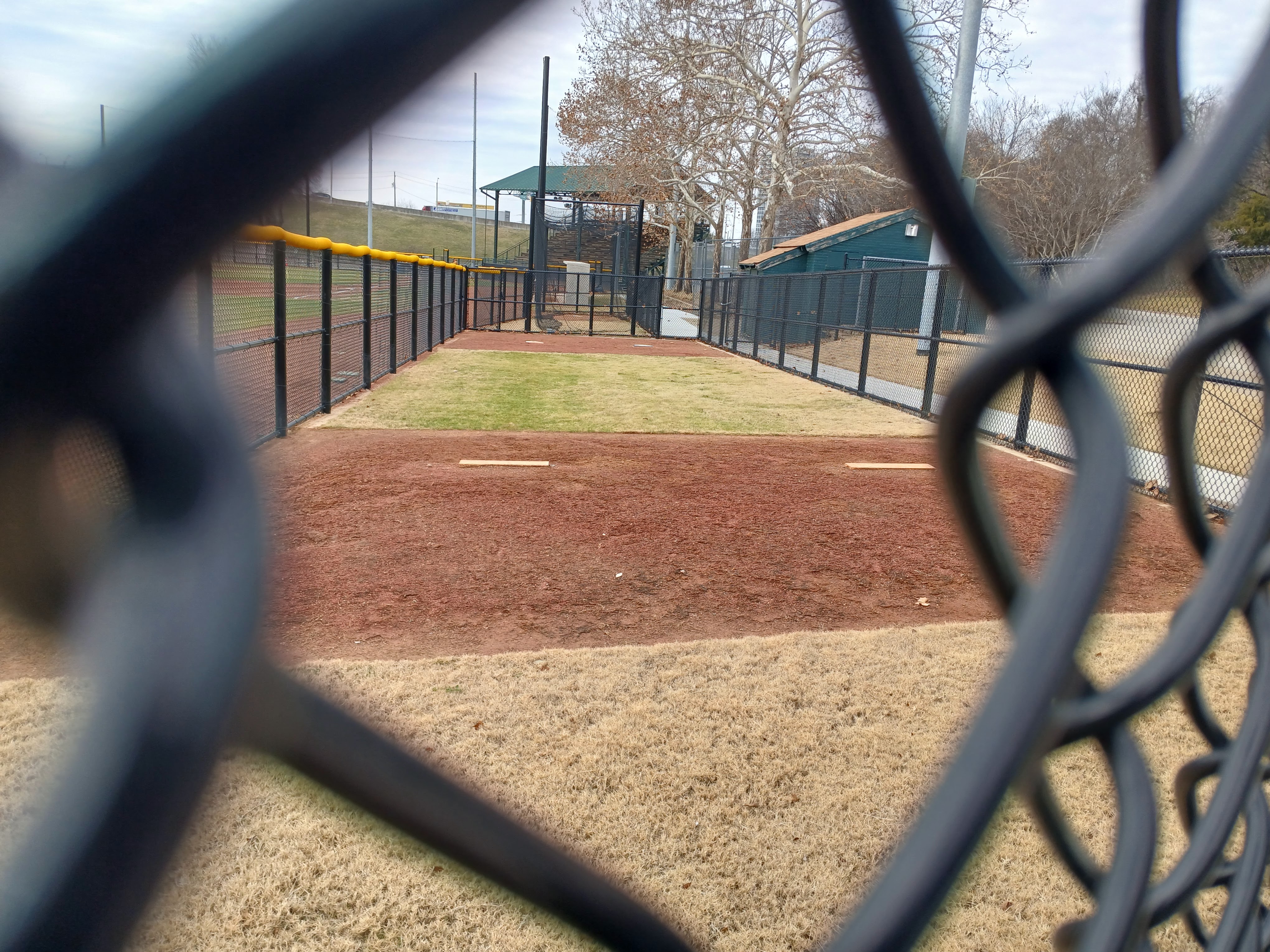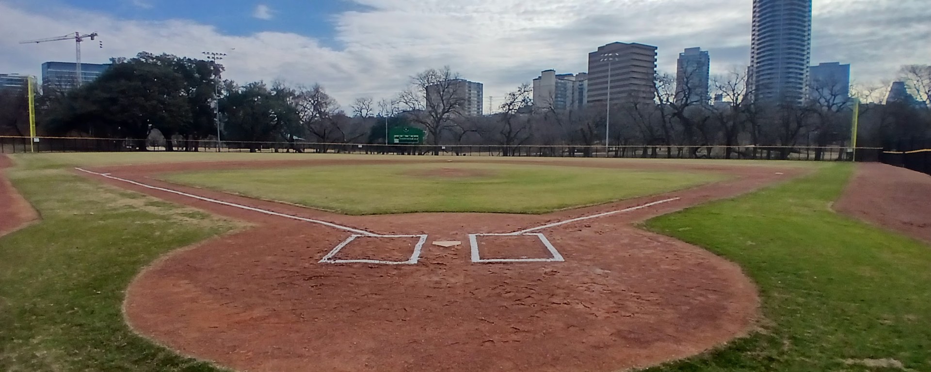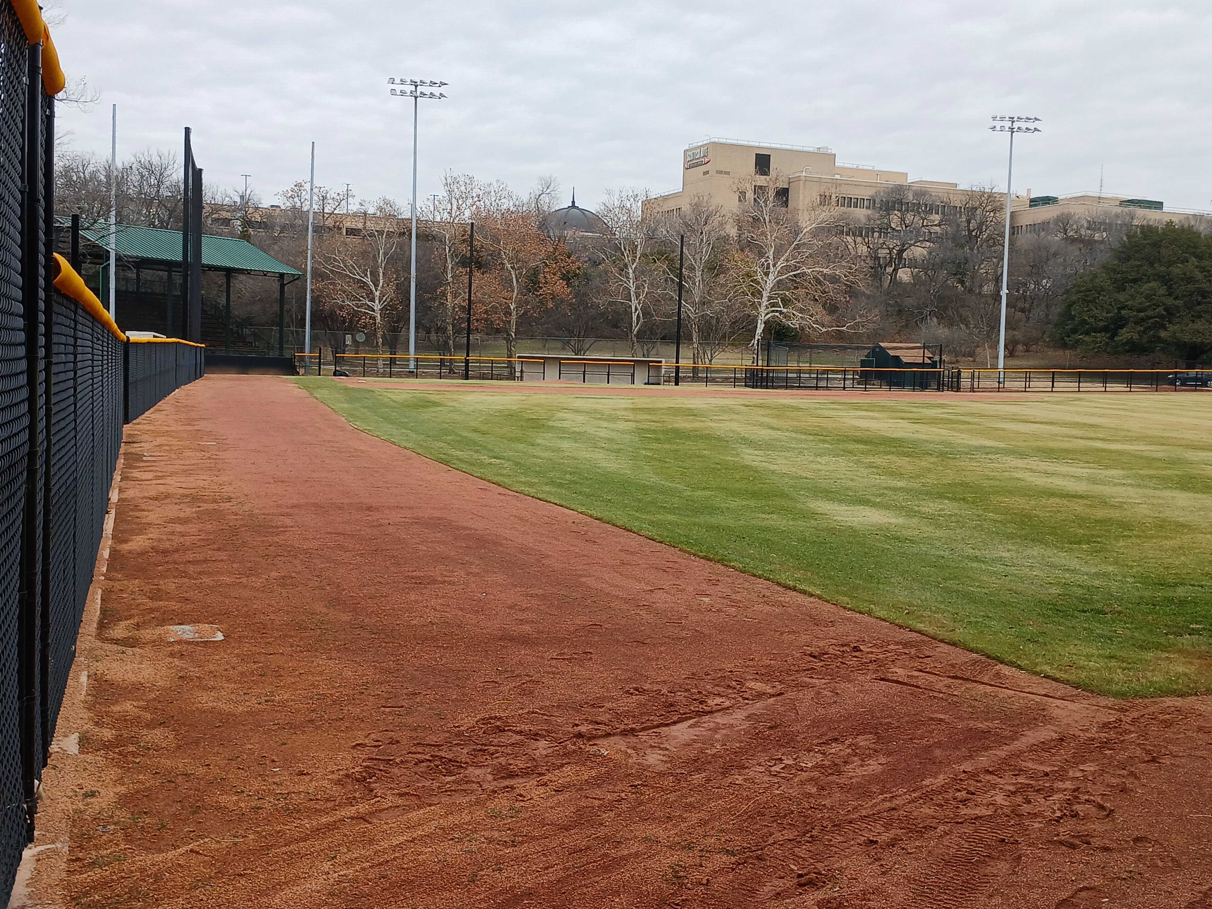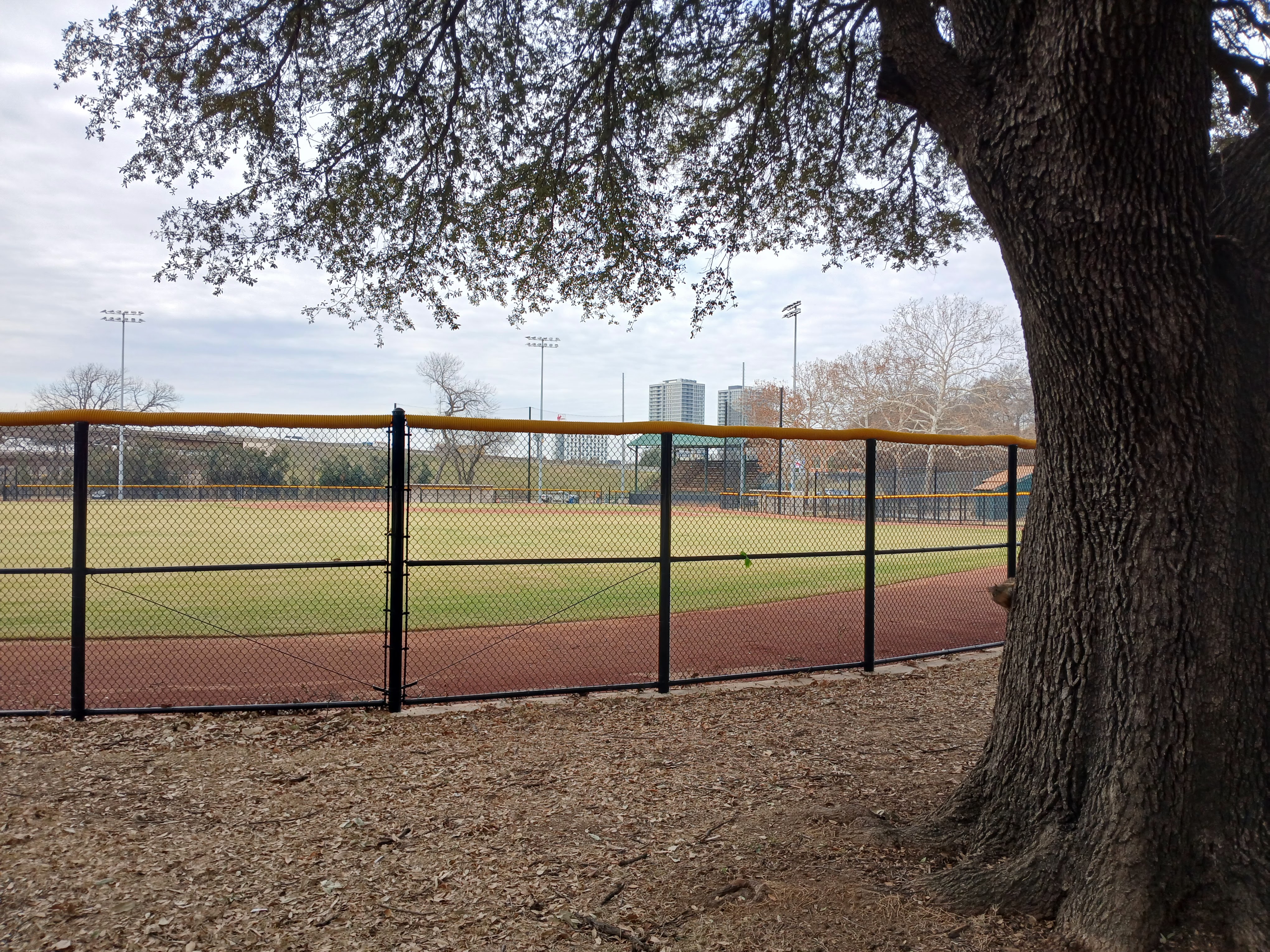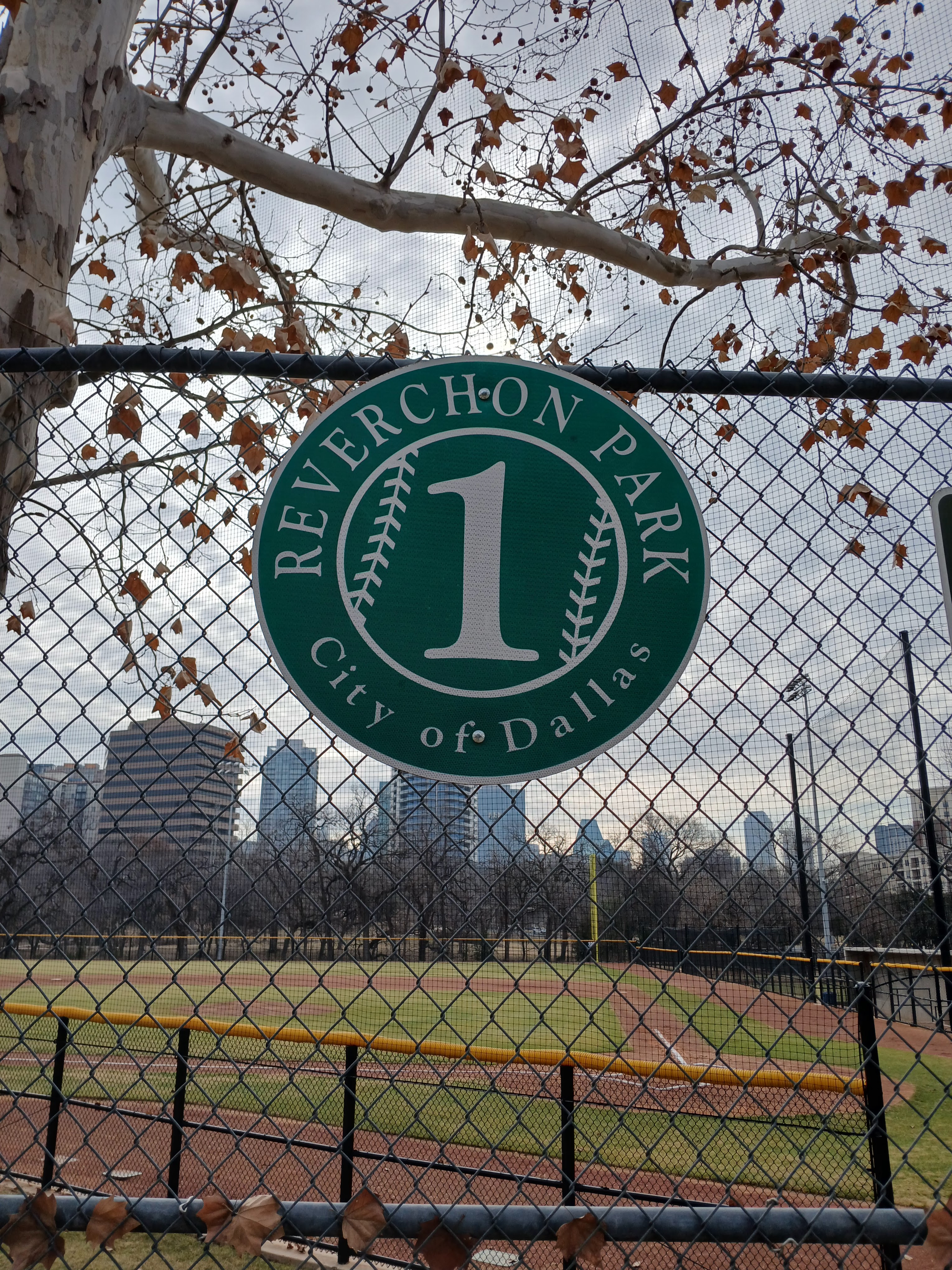 This past week, I was in Dallas, Texas for work (ArcBest) and found some time on Wednesday morning to check out some local baseball spots. After a quick Google Maps search of baseball fields near my hotel, I found Reverchon Recreation Park and took the short drive to check it out. I was happy to see the park entrance was open and there was a clear path to the baseball field. I found some parking in the adjacent lot and approached the front gate area to get a close up view of Reverchon Baseball Park.