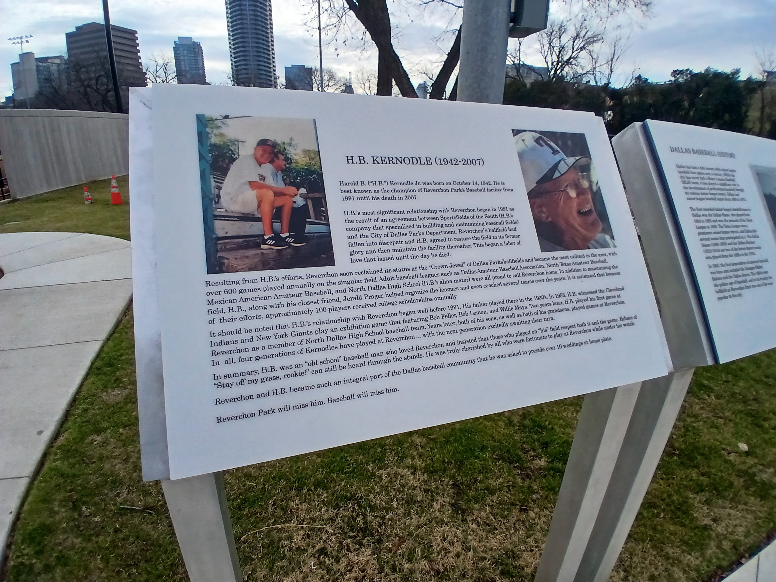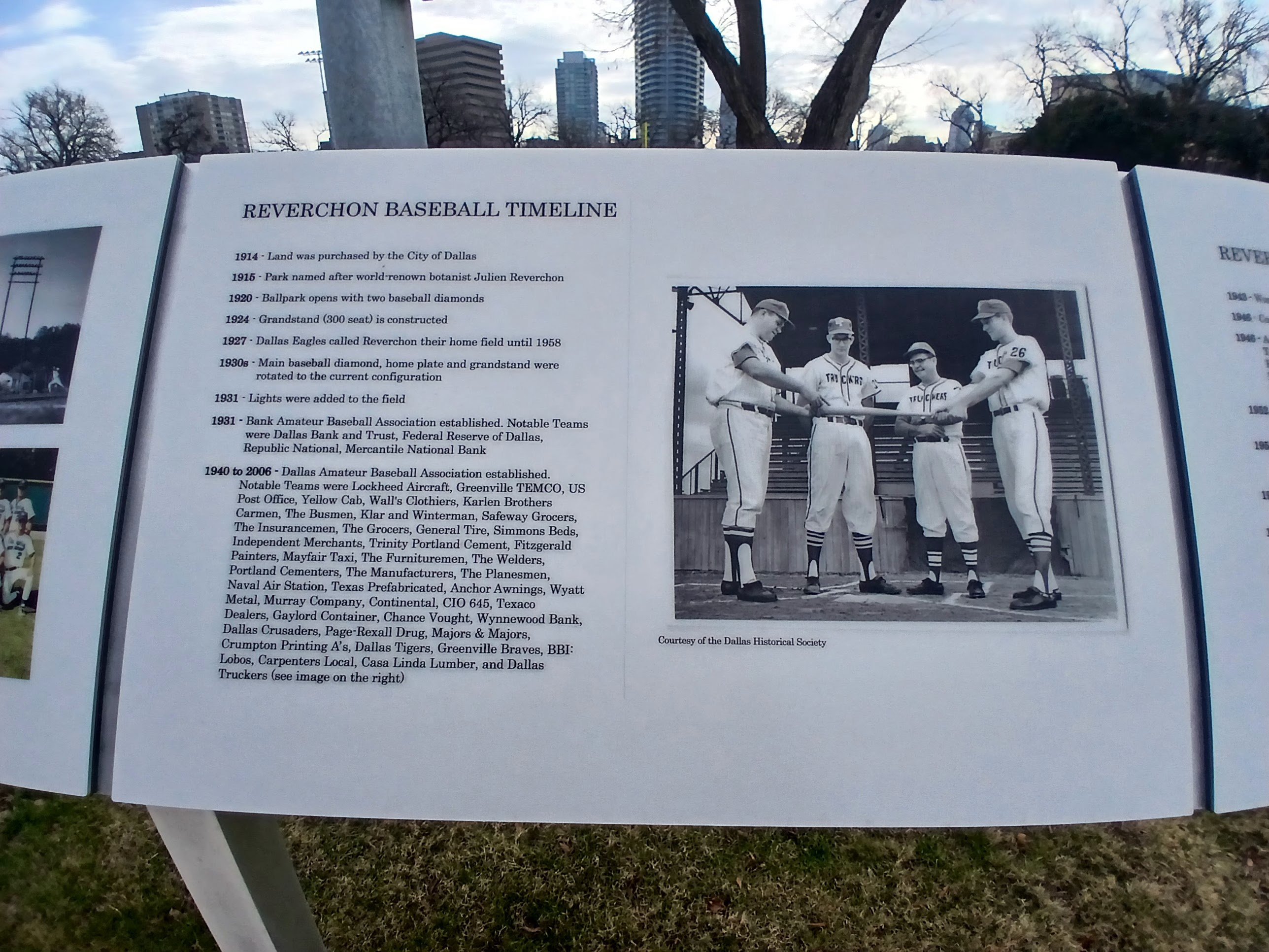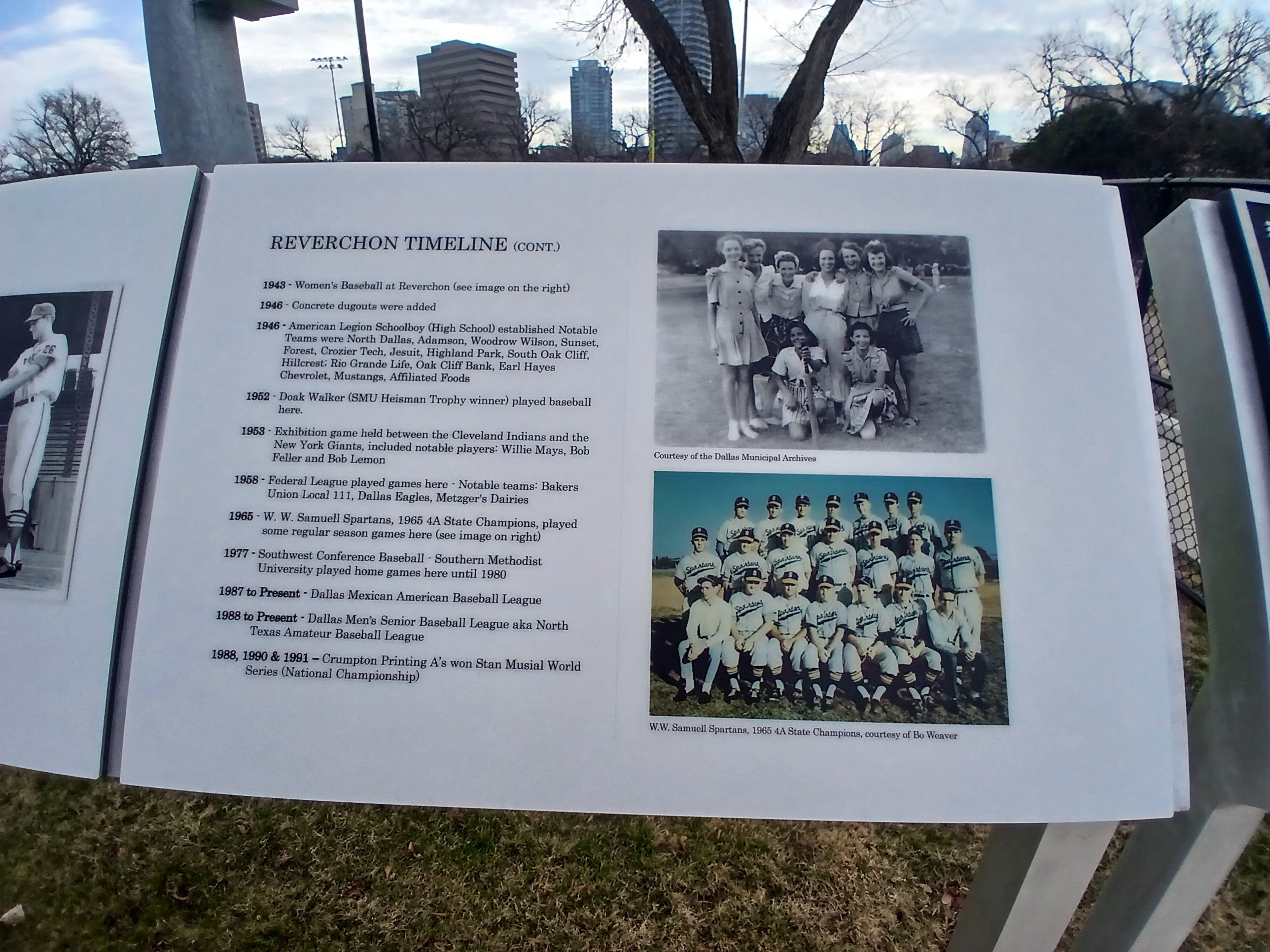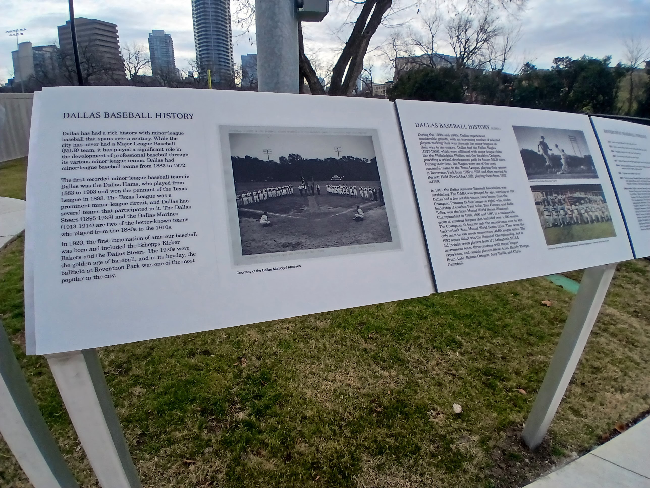 I loved the view from inside the park and took a moment to read some of the plaques that line the front gate area. Turns out Reverchon has a very distinct history in the story of Dallas baseball history. From women’s baseball to American Legion teams, from Senior Men’s Baseball to the Federal League, Reverchon Park has played host to a ton of great baseball in the City of Dallas. And that tradition continues, according to the Parks and Rec employee, the local High School JV Baseball team will call Reverchon Park home for the 2026 season. One last note, according to the plaques, lights were added to Reverchon in 1931, so there has been day and night baseball there for almost a century. Wow, what a find.