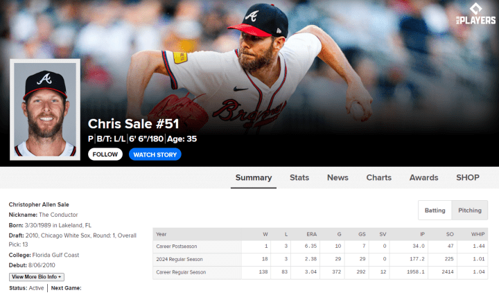 Atlanta Braves LHP (Left Handed Pitcher) Chris Sale enjoyed a tremendous bounce back 2024 season. Sale won the National League Triple Crown (unofficial title) by leading the NL in Wins, ERA, and Strikeouts. Sale also won the National League Gold … Continue reading Red Sox Or Not, I Couldn’t Help Rooting For Chris Sale in 2024